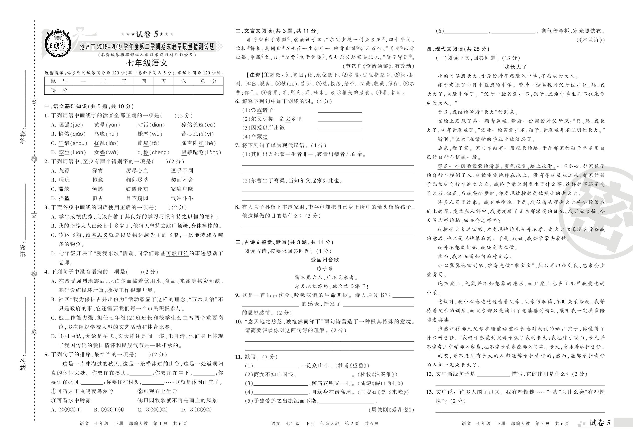 2018-2019学年第二学期池州市七年级语文试卷(人教版)【5】