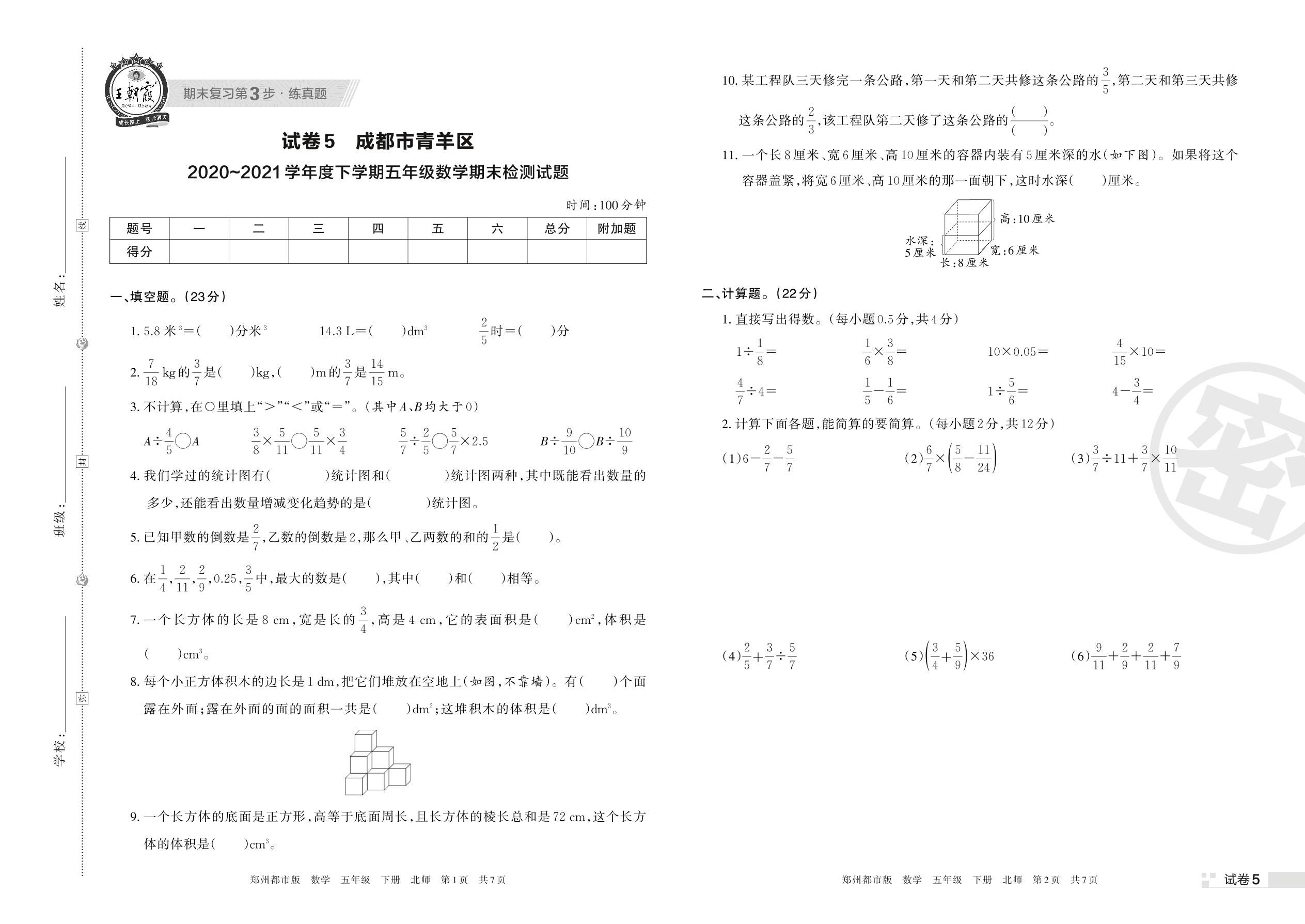 成都市青羊区2020~2021学年度下学期五年级数学期末检测试题(北师版)【5】