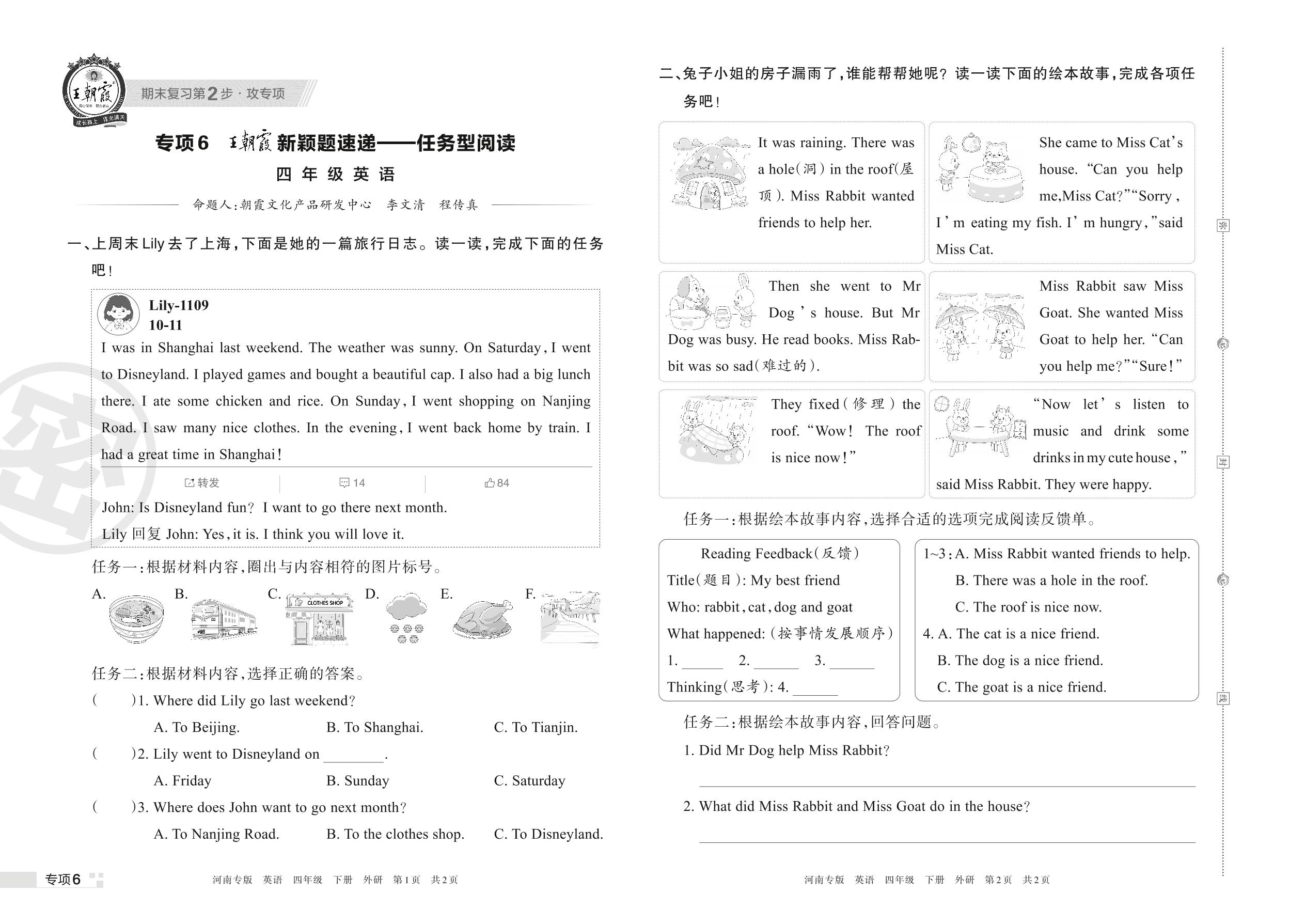 王朝霞期末专项卷——新颖题速递:任务型阅读四年级下册英语(外研版)【6】