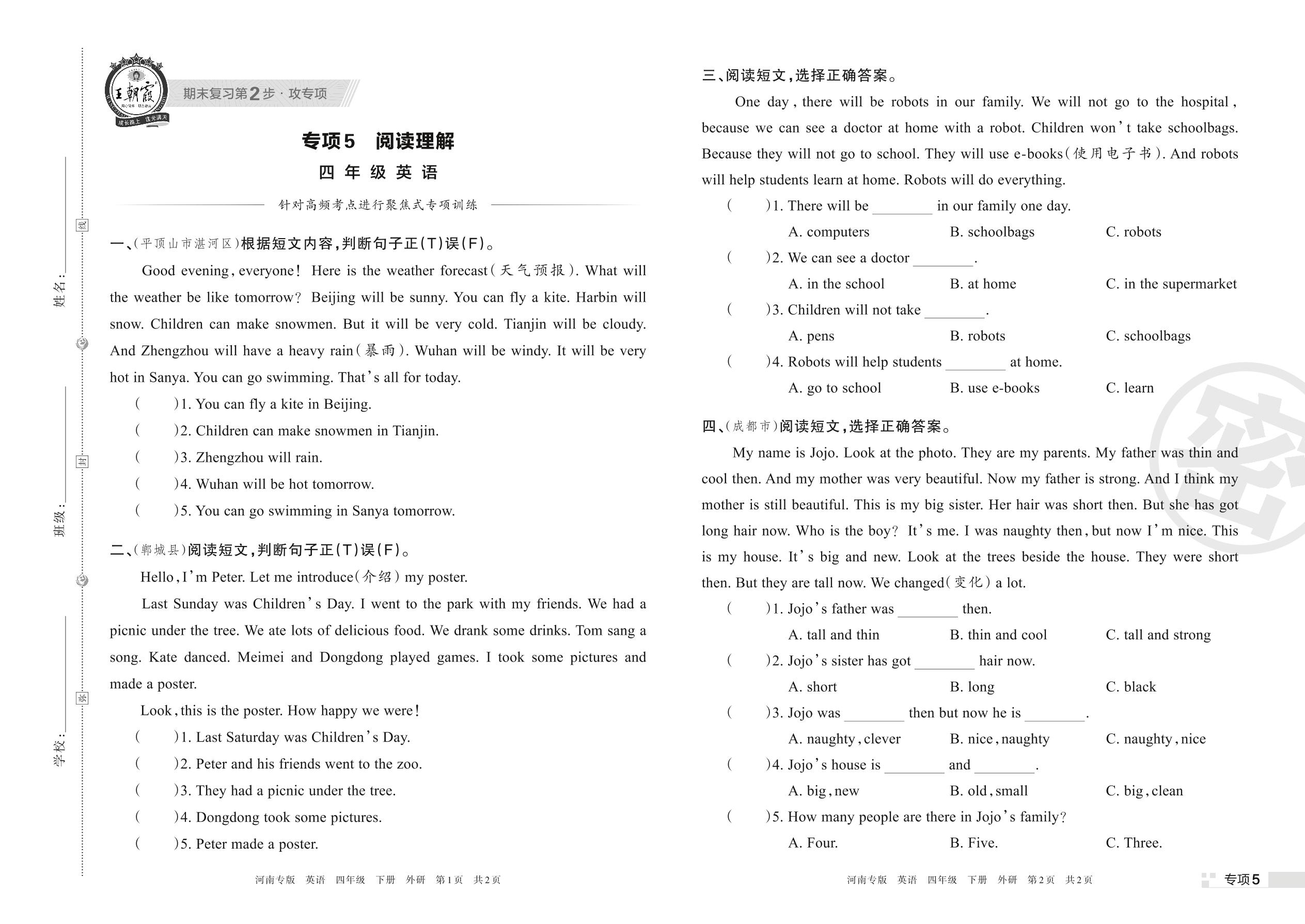 王朝霞期末专项卷——阅读理解四年级下册英语(外研版)【5】