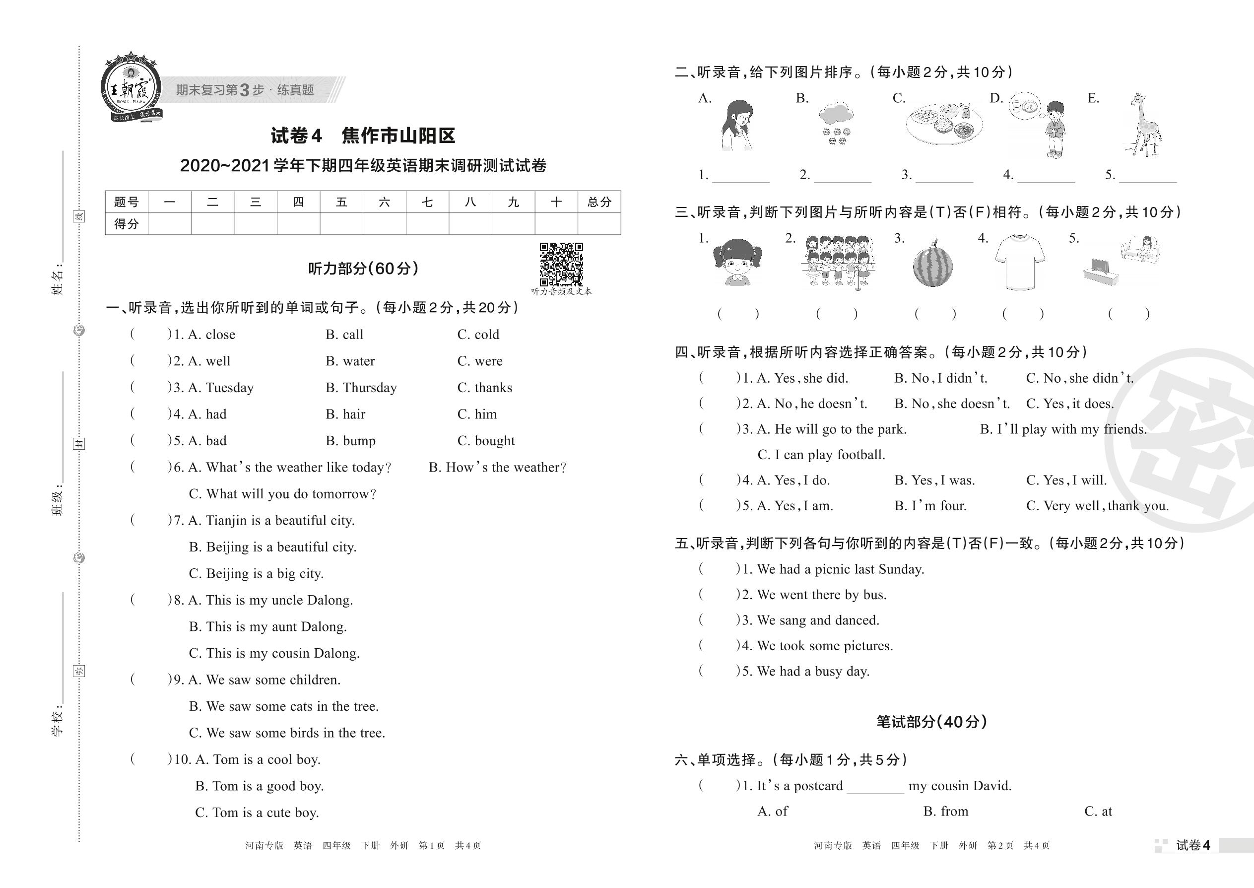 焦作市山阳区2020~2021学年下期四年级英语期末调研测试试卷(外研版)【4】