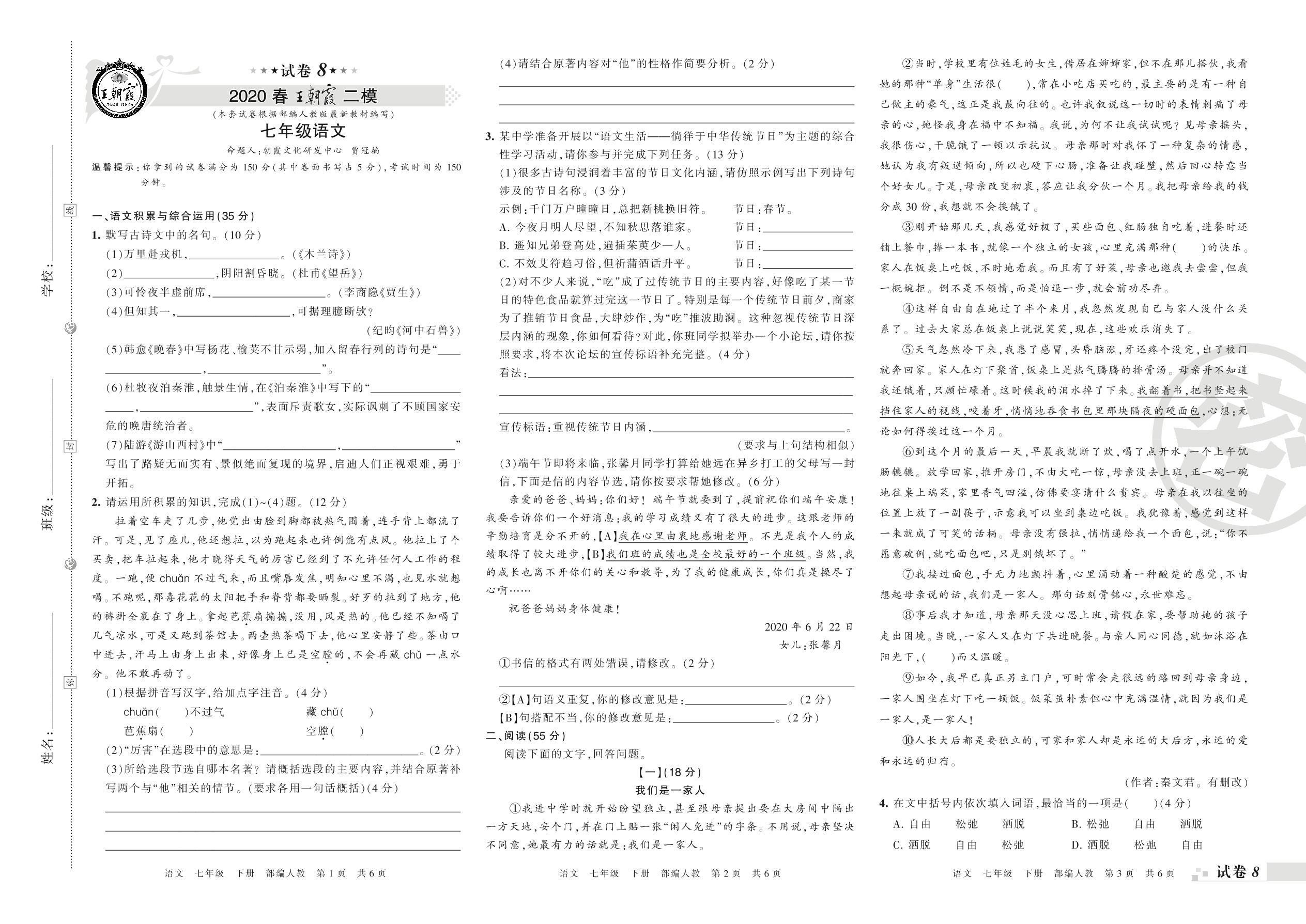 王朝霞期末模拟卷七年级下册语文(人教版)_R21080220124【8】