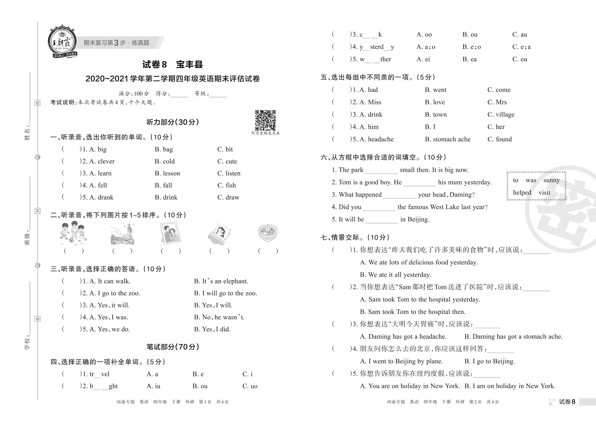 宝丰县2020~2021学年第二学期四年级英语期末评估试卷(外研版)【8】