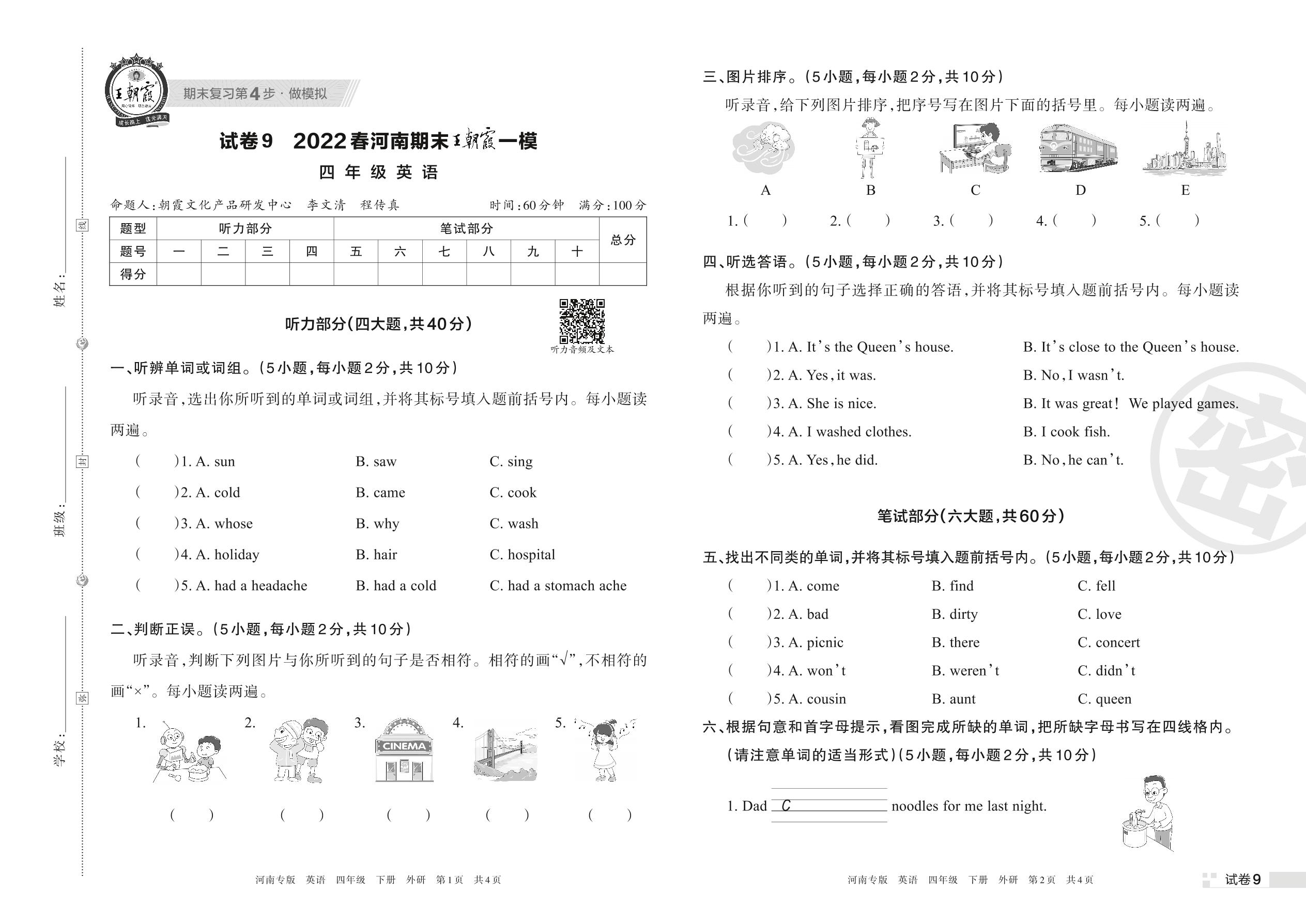 王朝霞期末模拟卷四年级下册英语(外研版)【9】