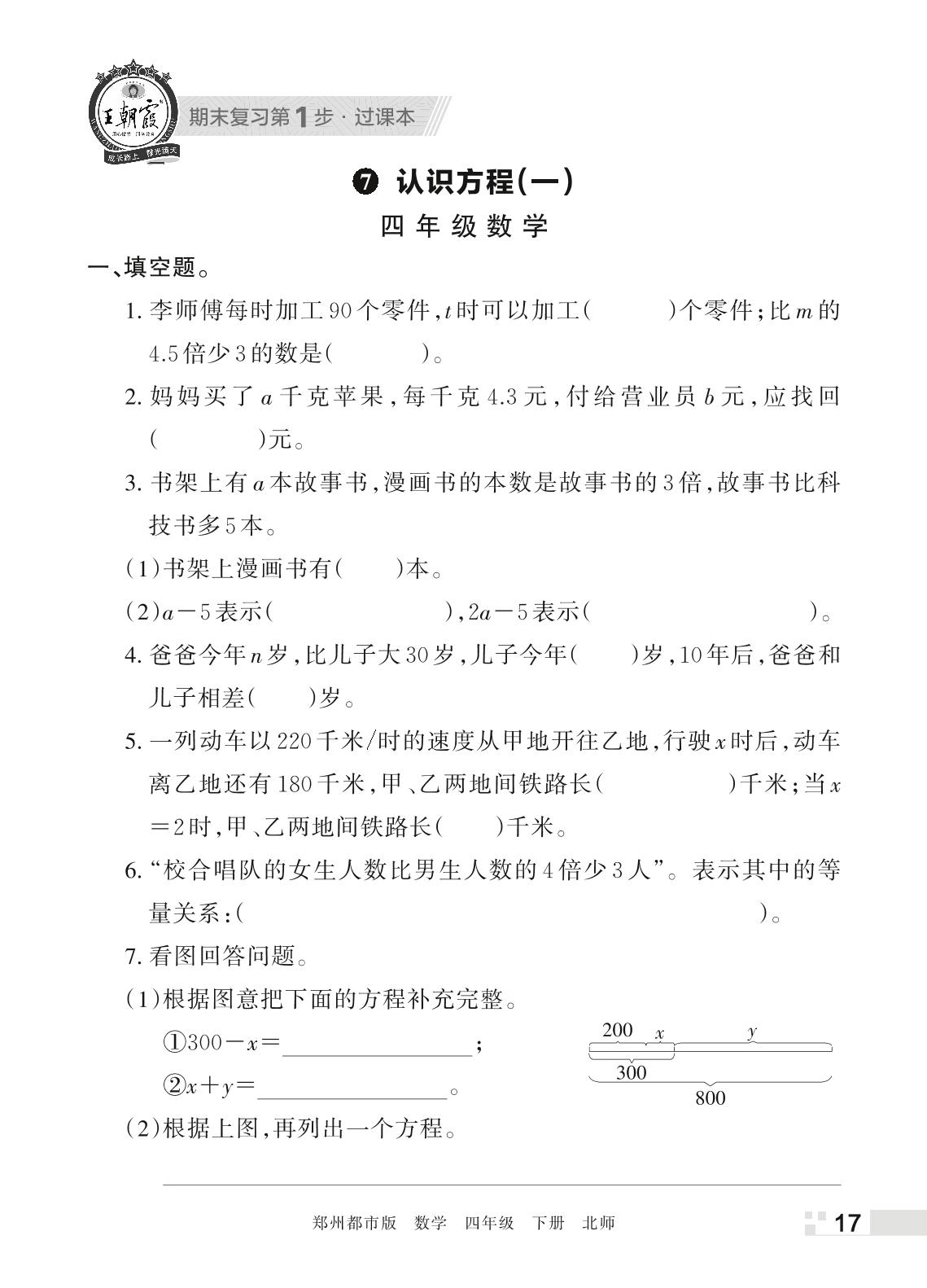 王朝霞期末过课本——7 认识方程(一)四年级下册数学(北师版)_R220331111418987