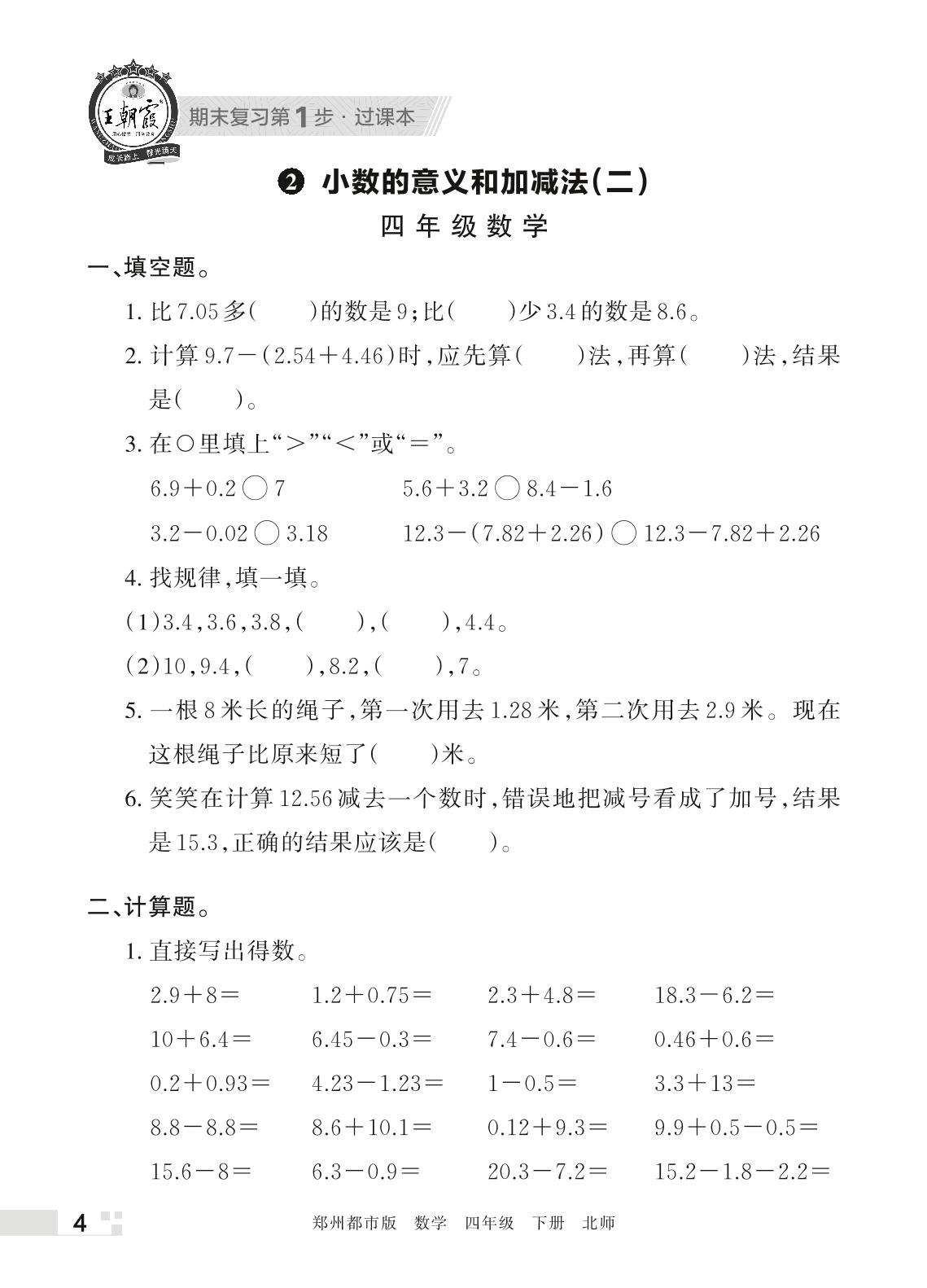 王朝霞期末过课本——2 小数的意义和加减法(二)四年级下册数学(北师版)_R220331111419133