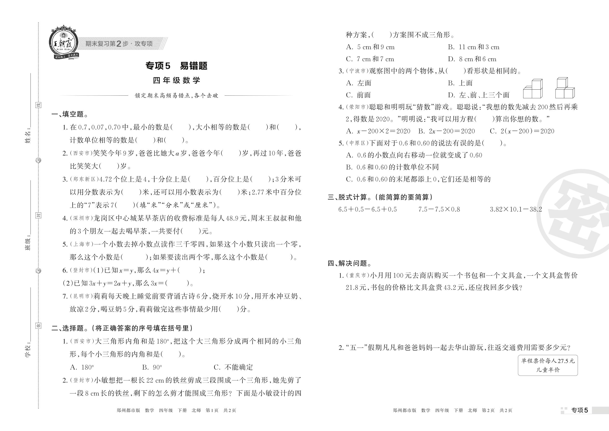 王朝霞期末专项卷——易错题四年级下册数学(北师版)_R220331111419331【5】