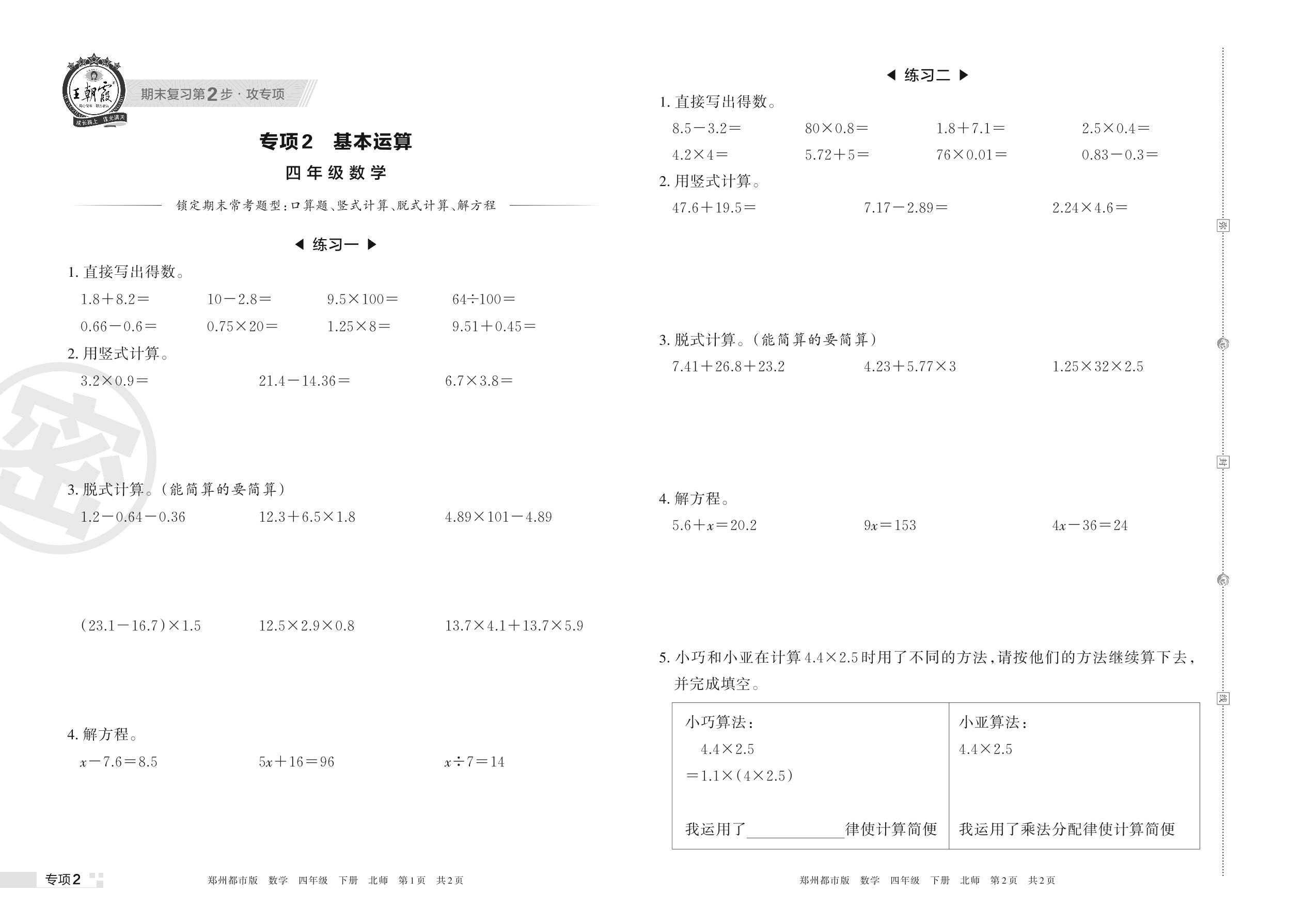 王朝霞期末专项卷——基本运算四年级下册数学(北师版)_R220331111419369【2】