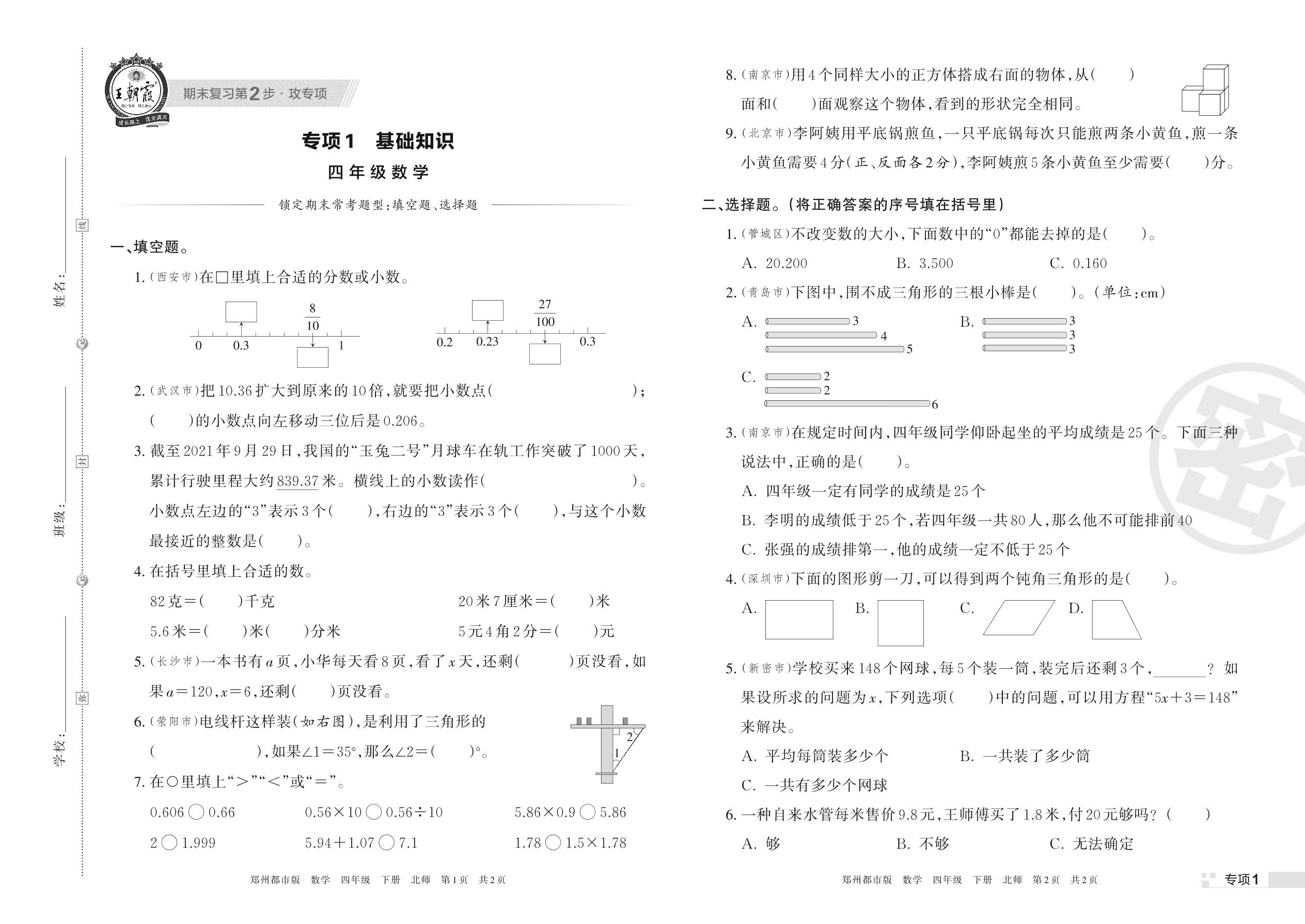 王朝霞期末专项卷——基础知识四年级下册数学(北师版)_R220331111420846【1】