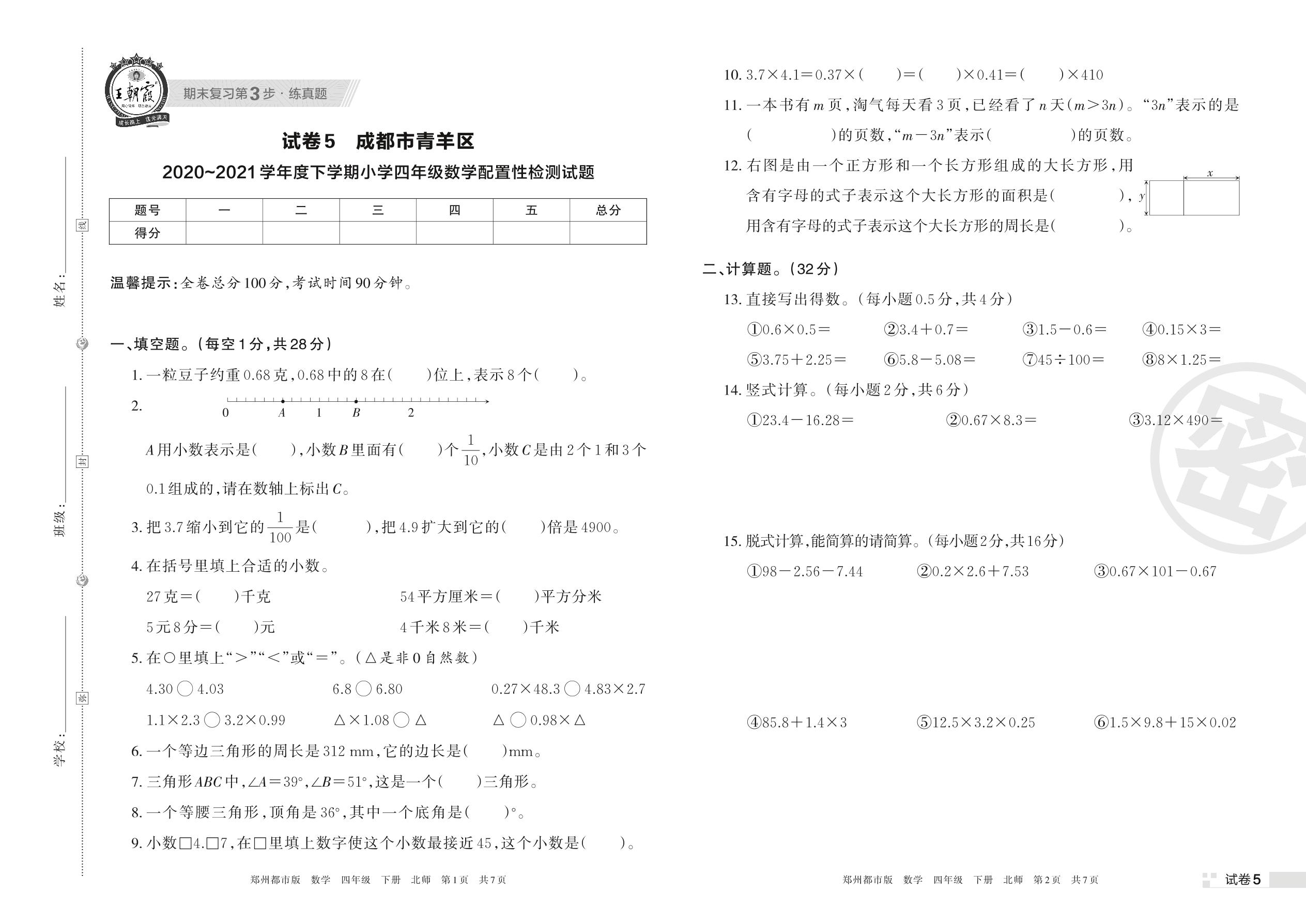 成都市青羊区2020~2021学年度下学期小学四年级数学配置性检测试题(北师版)【5】