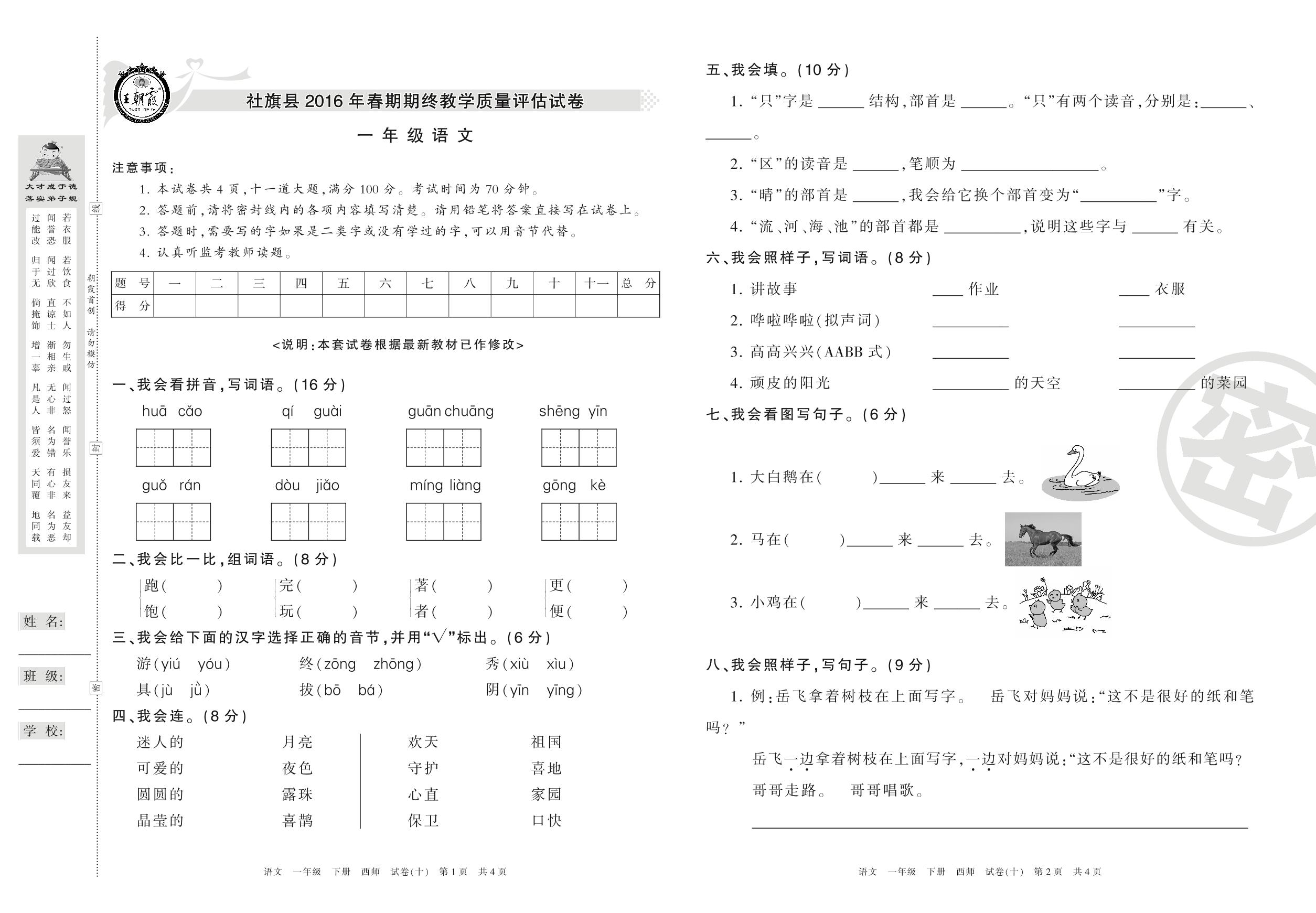 2015-2016学年第二学期南阳市社旗县一年级语文试卷(西师版)【10】