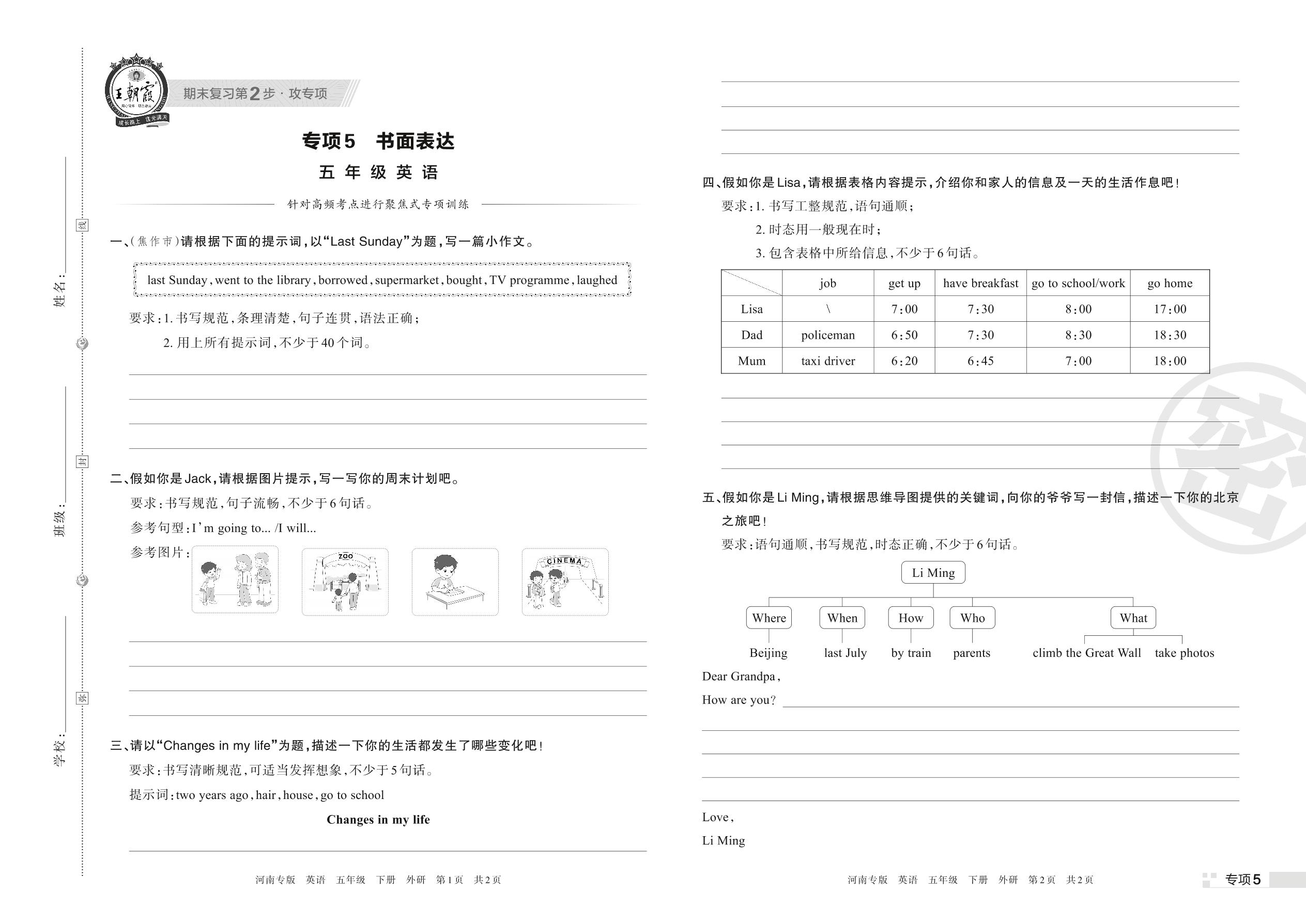 王朝霞期末专项卷——书面表达五年级下册英语(外研版)【5】