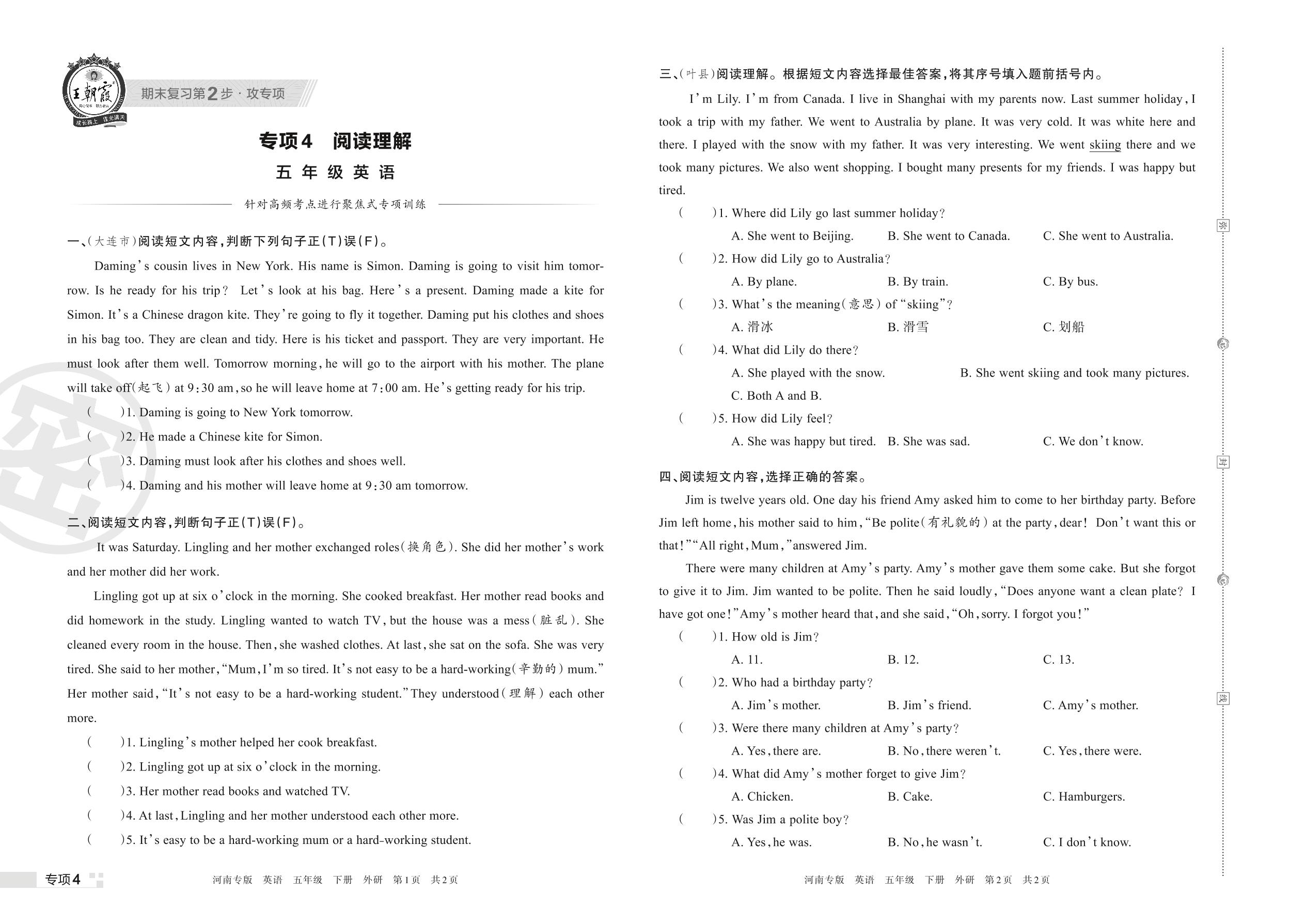 王朝霞期末专项卷——阅读理解五年级下册英语(外研版)【4】