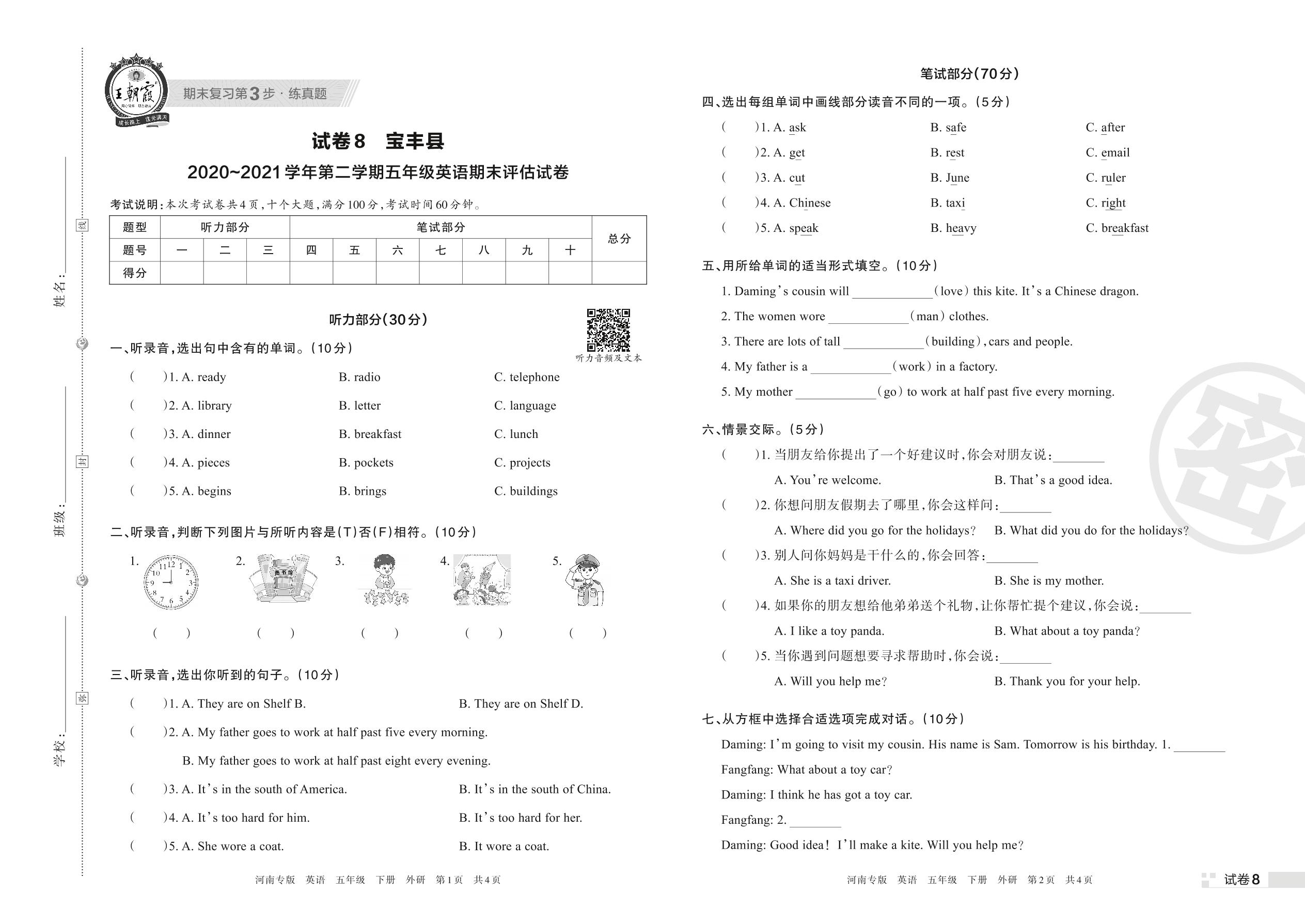 宝丰县2020~2021学年第二学期五年级英语期末评估试卷(外研版)【8】