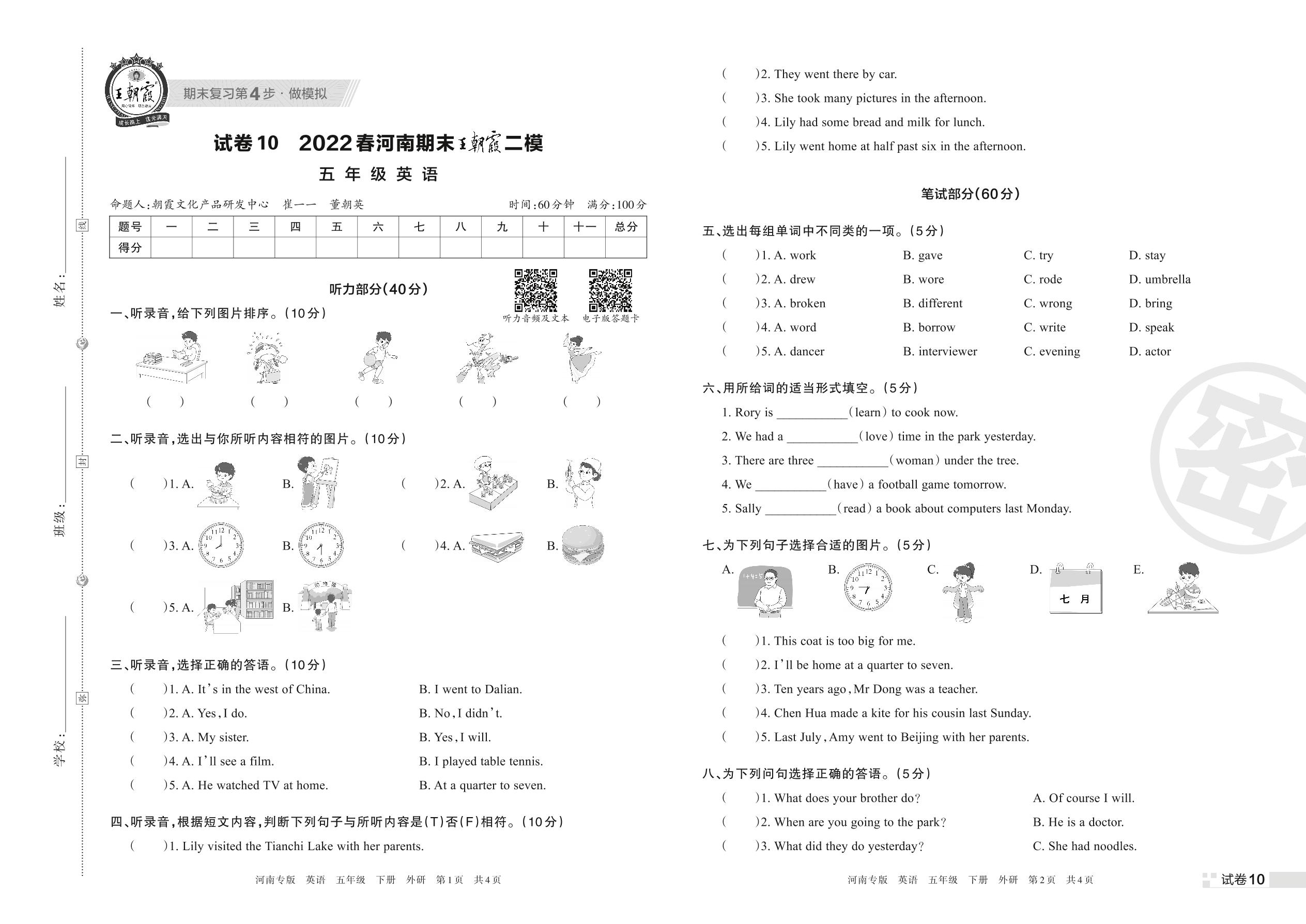 王朝霞期末模拟卷五年级下册英语(外研版)【10】