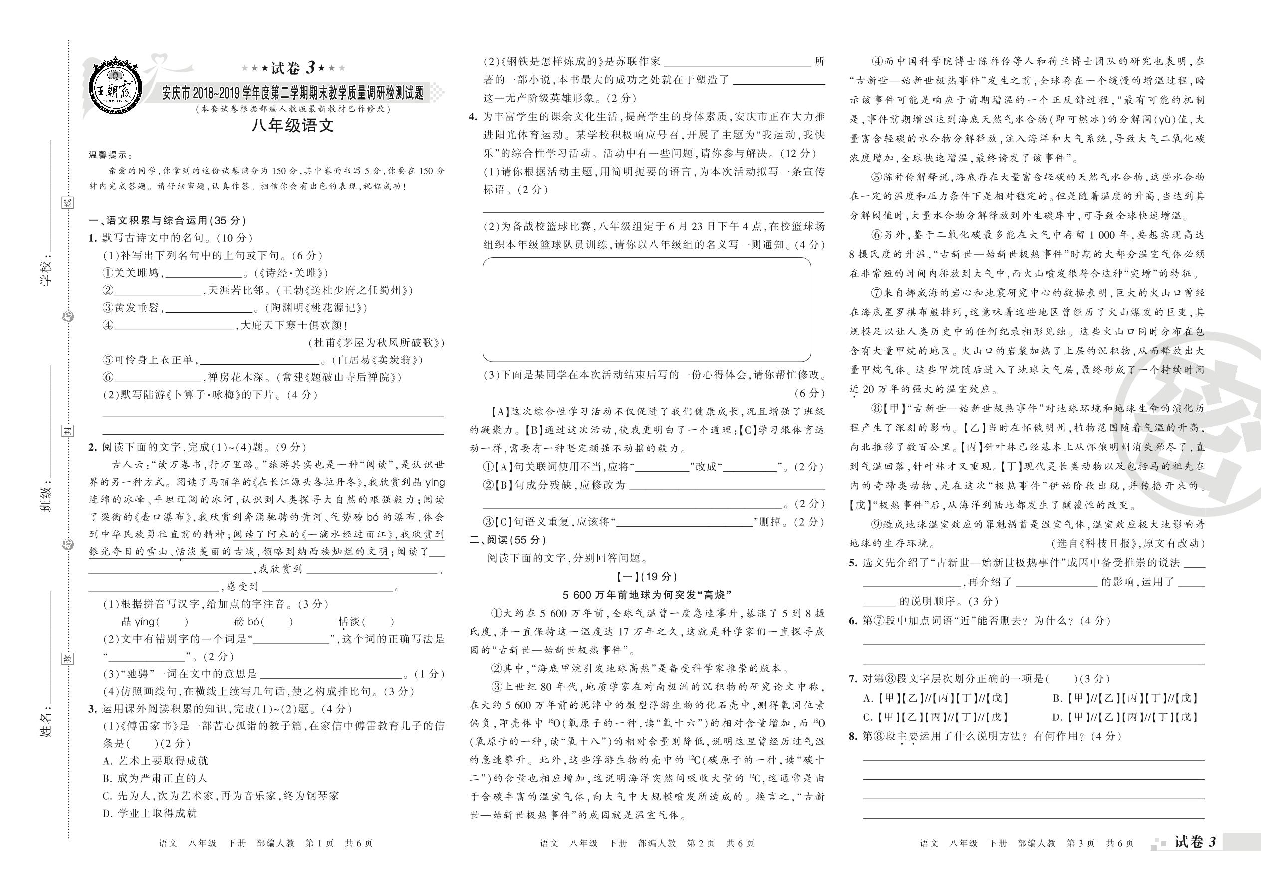 2018-2019学年第二学期安庆市八年级语文试卷(人教版)【3】