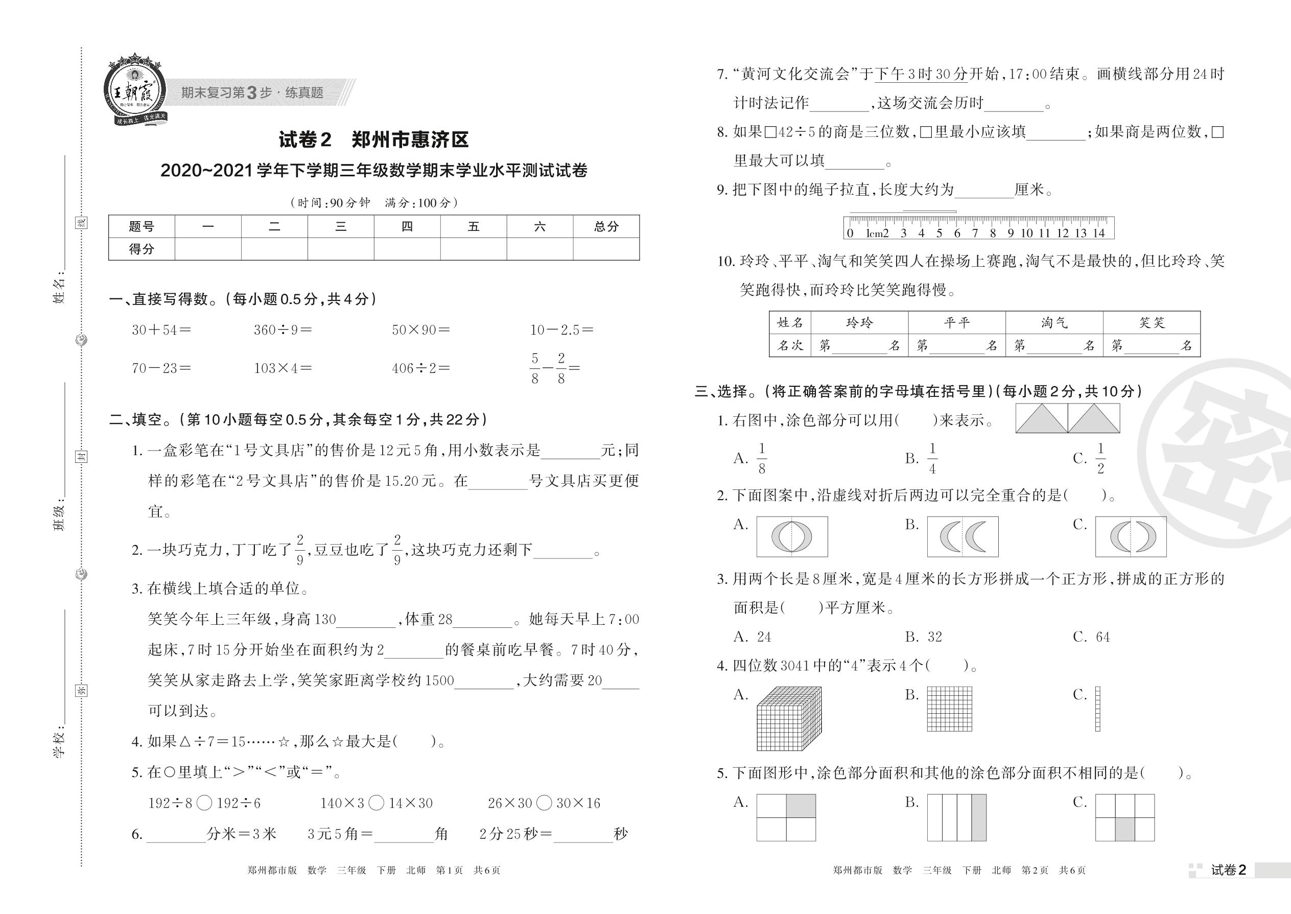 郑州市惠济区2020~2021学年下学期三年级数学期末学业水平测试试卷(北师版)【2】