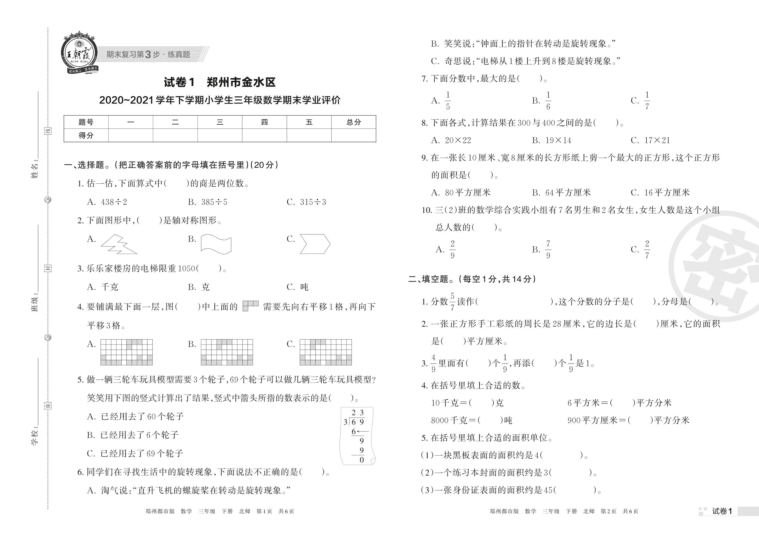 郑州市金水区2020~2021学年下学期小学生三年级数学期末学业评价(北师版)【1】