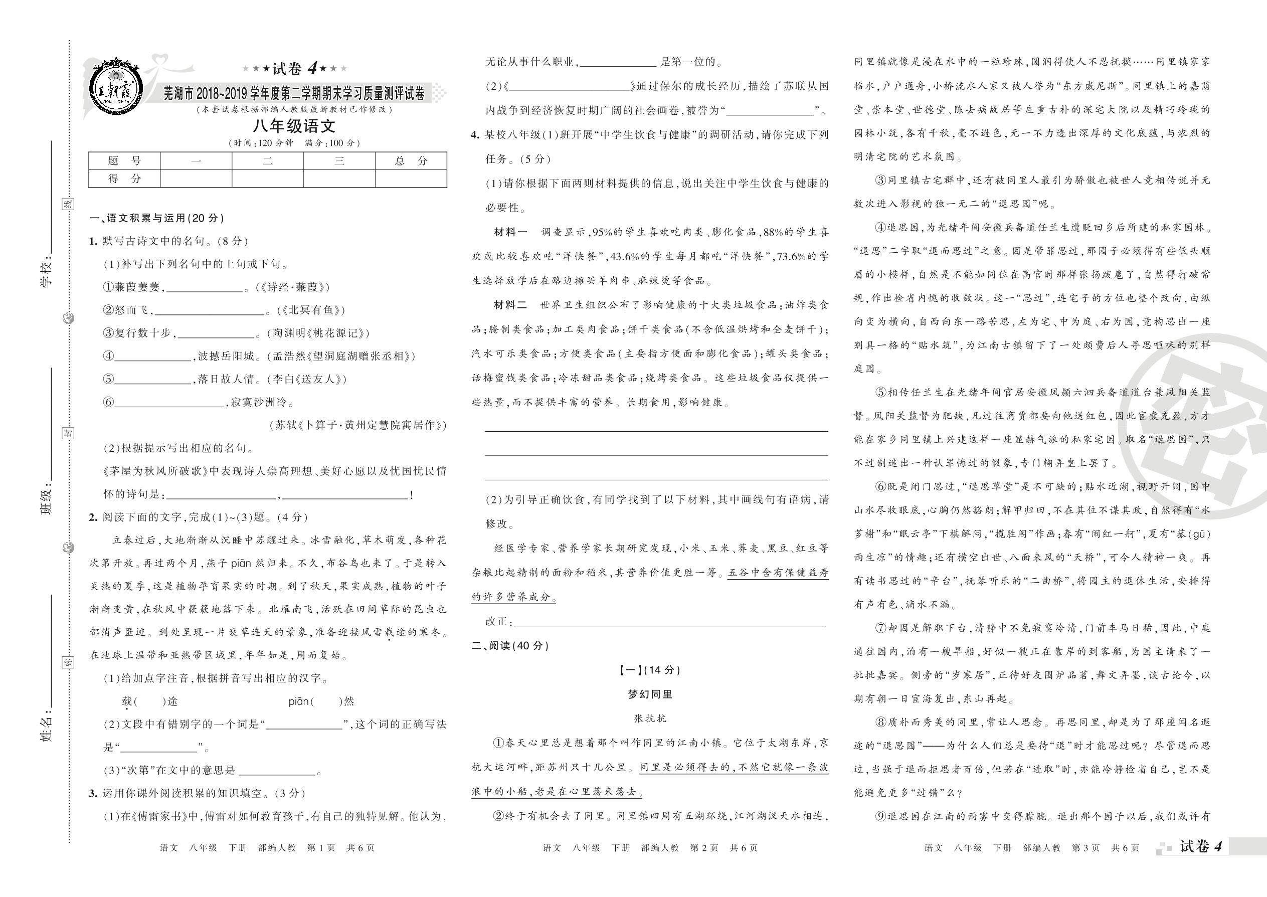 2018-2019学年第二学期芜湖市八年级语文试卷(人教版)【4】