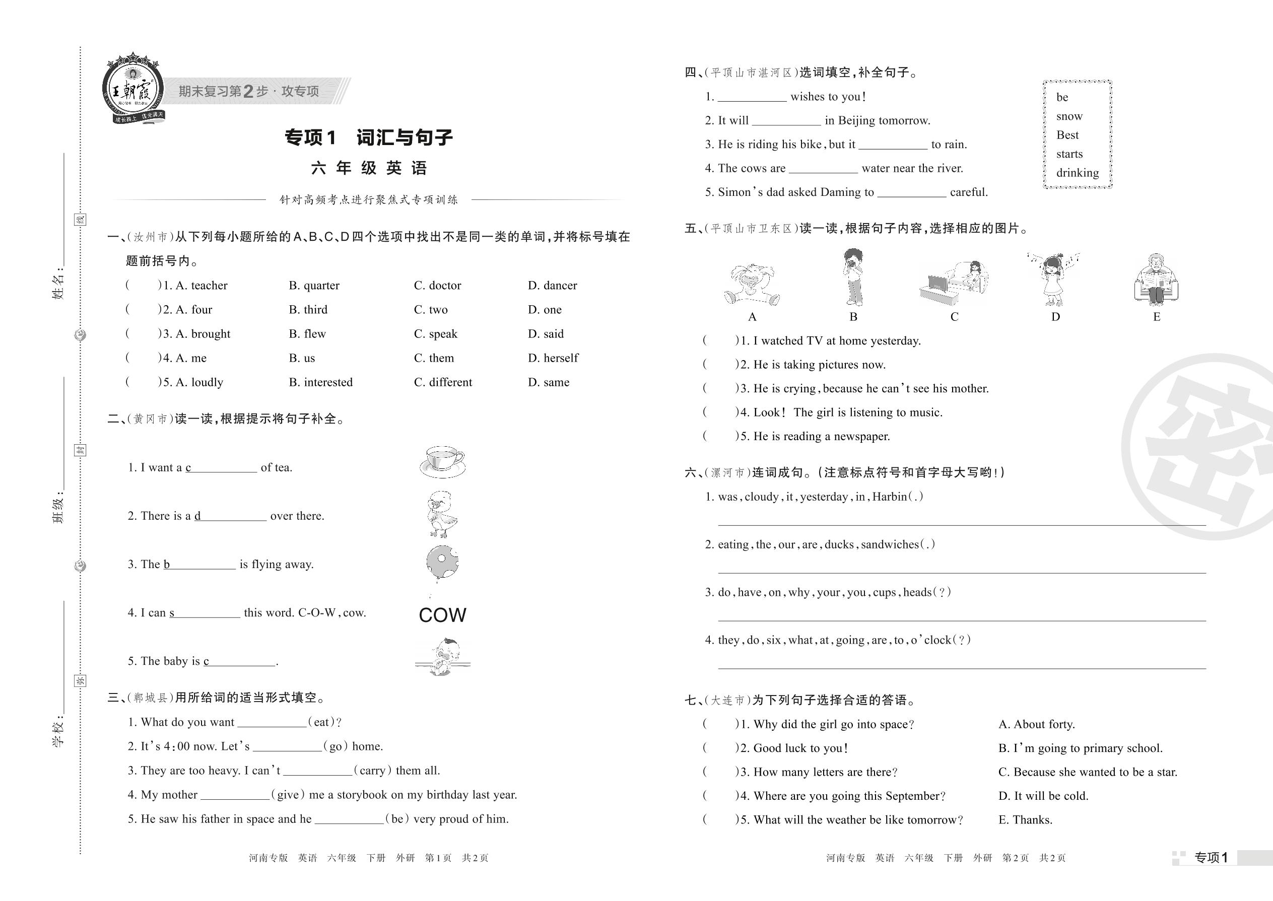 王朝霞期末专项卷——词汇与句子六年级下册英语(外研版)【1】