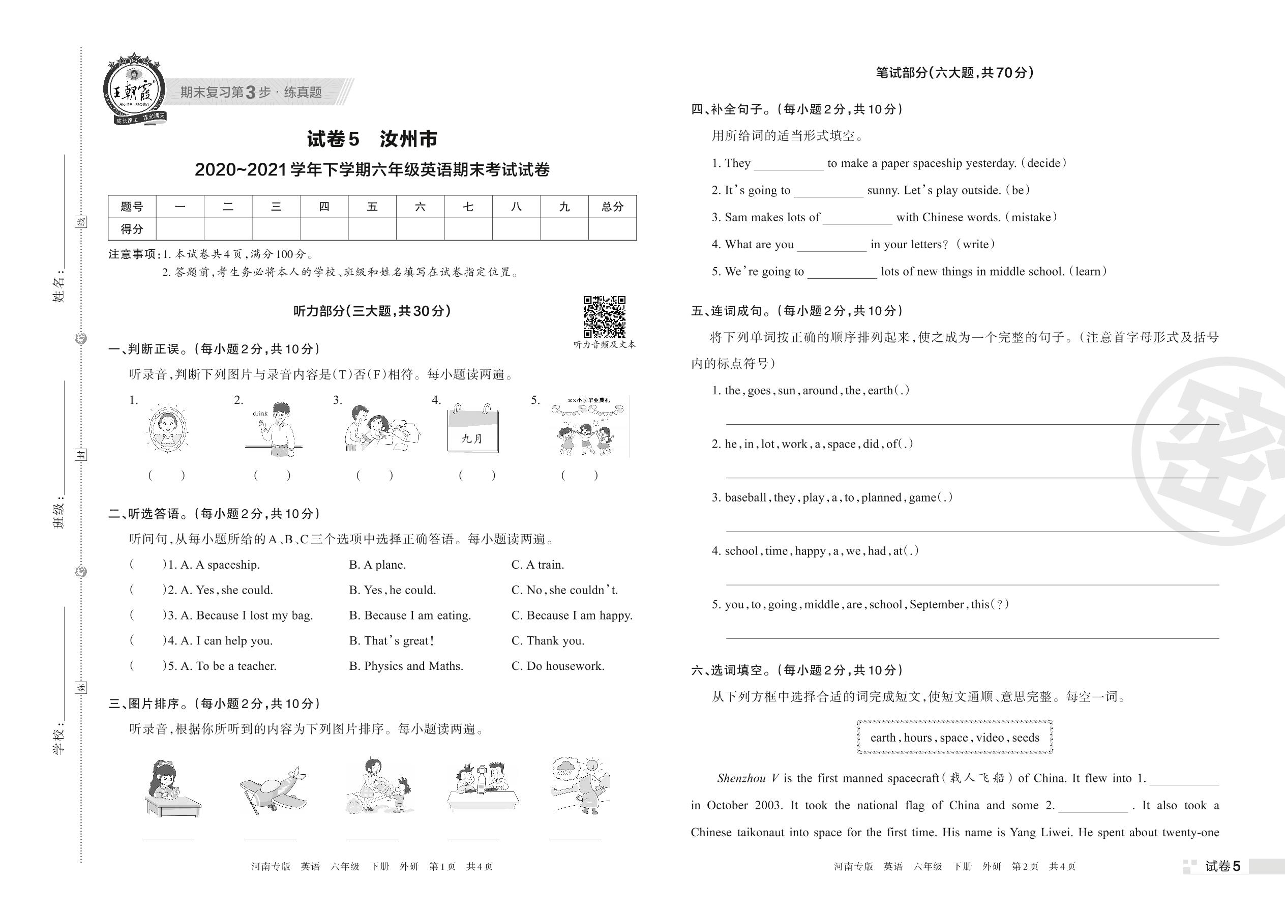 汝州市2020~2021学年下学期六年级英语期末考试试卷(外研版)【5】