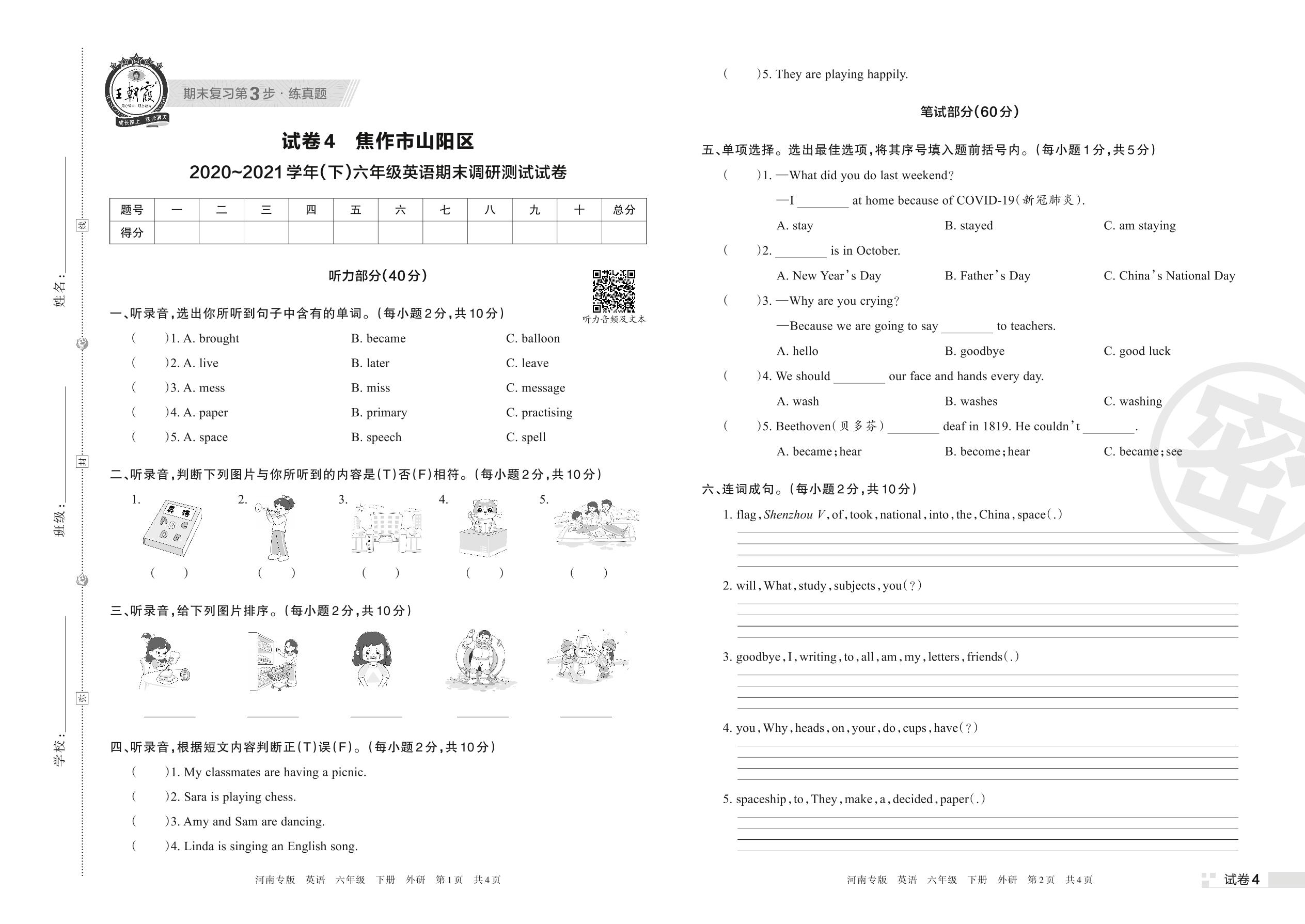 焦作市山阳区2020~2021学年(下)六年级英语期末调研测试试卷(外研版)【4】