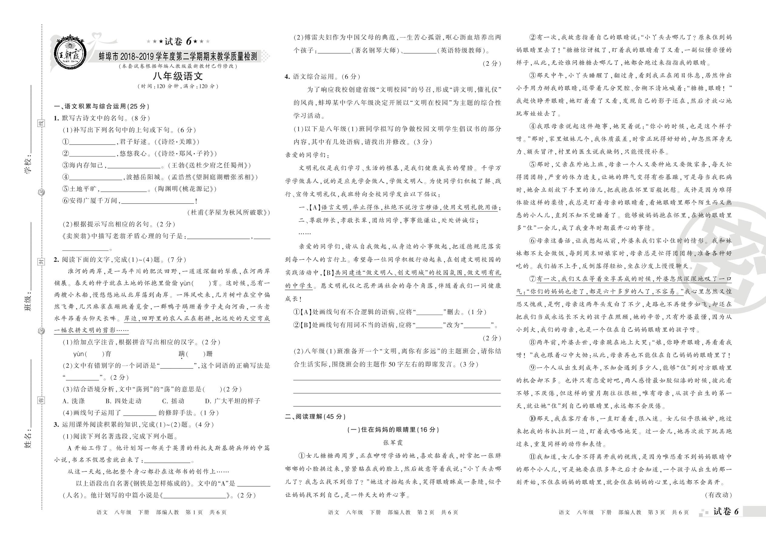 2018-2019学年第二学期蚌埠市八年级语文试卷(人教版)【6】