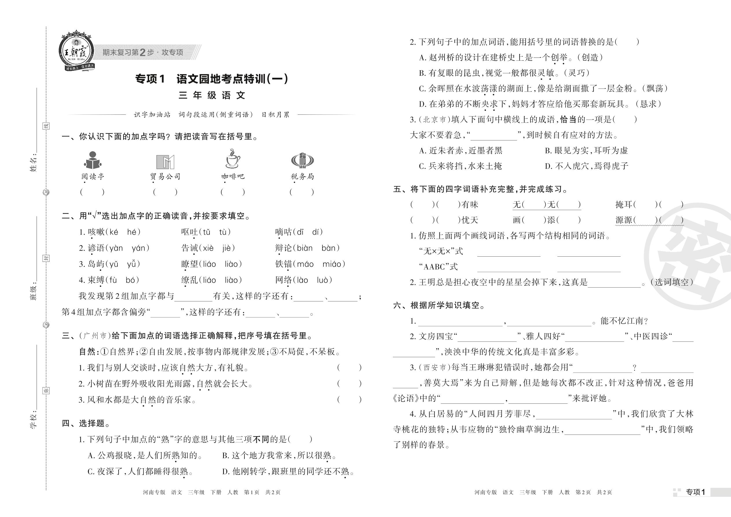 王朝霞期末专项卷——语文园地考点特训(一)三年级下册语文(人教版)_R220331134143665【1】