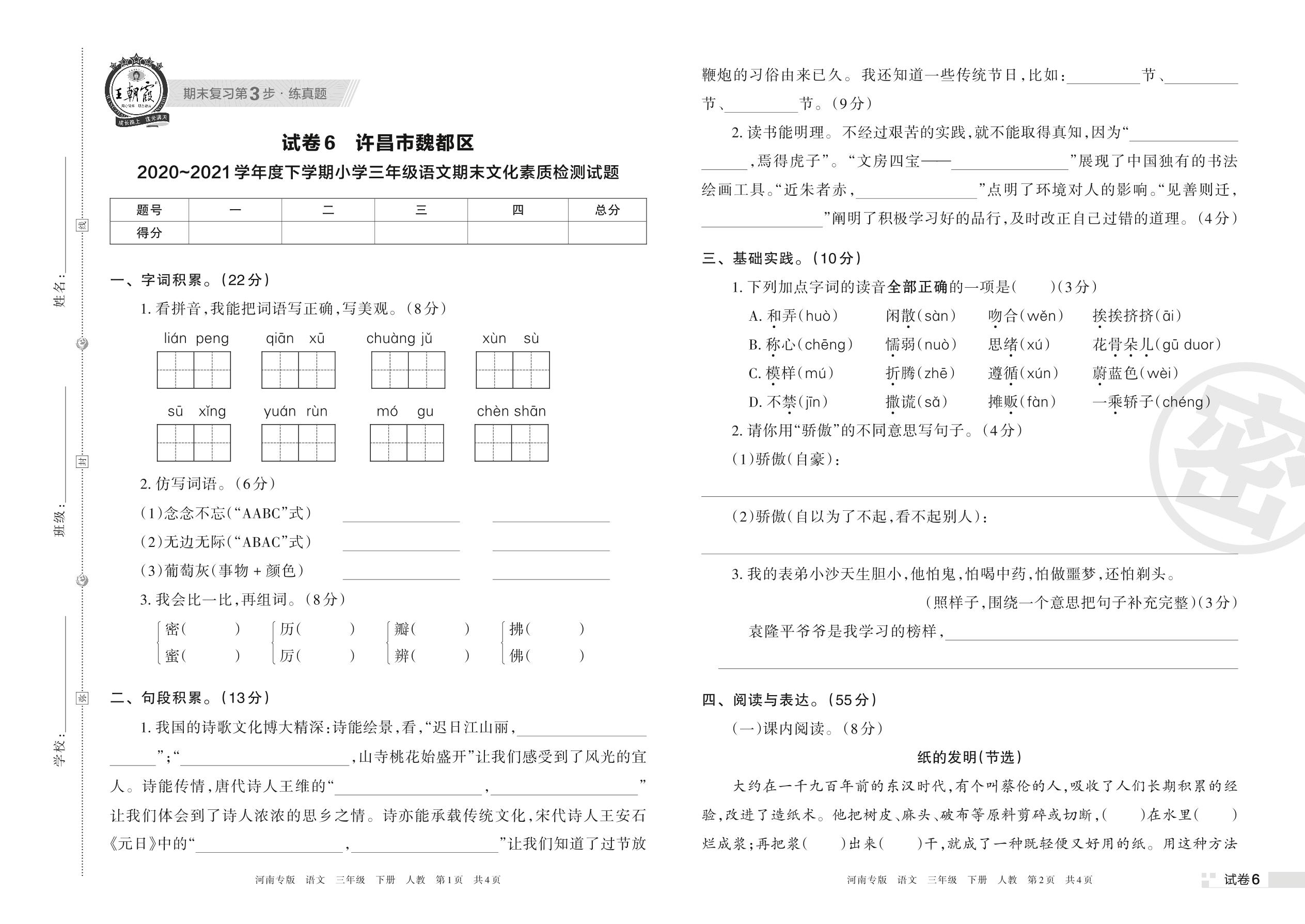 许昌市魏都区2020~2021学年度下学期小学三年级语文期末文化素质检测试题(人教版)【6】