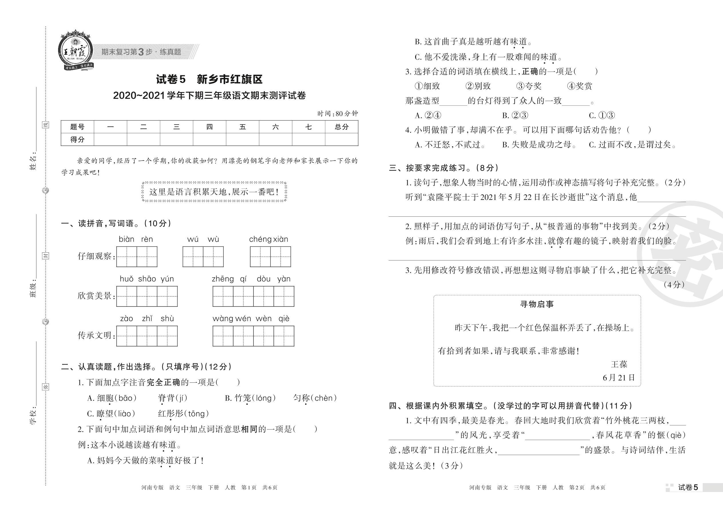 新乡市红旗区2020~2021学年下期三年级语文期末测评试卷(人教版)【5】