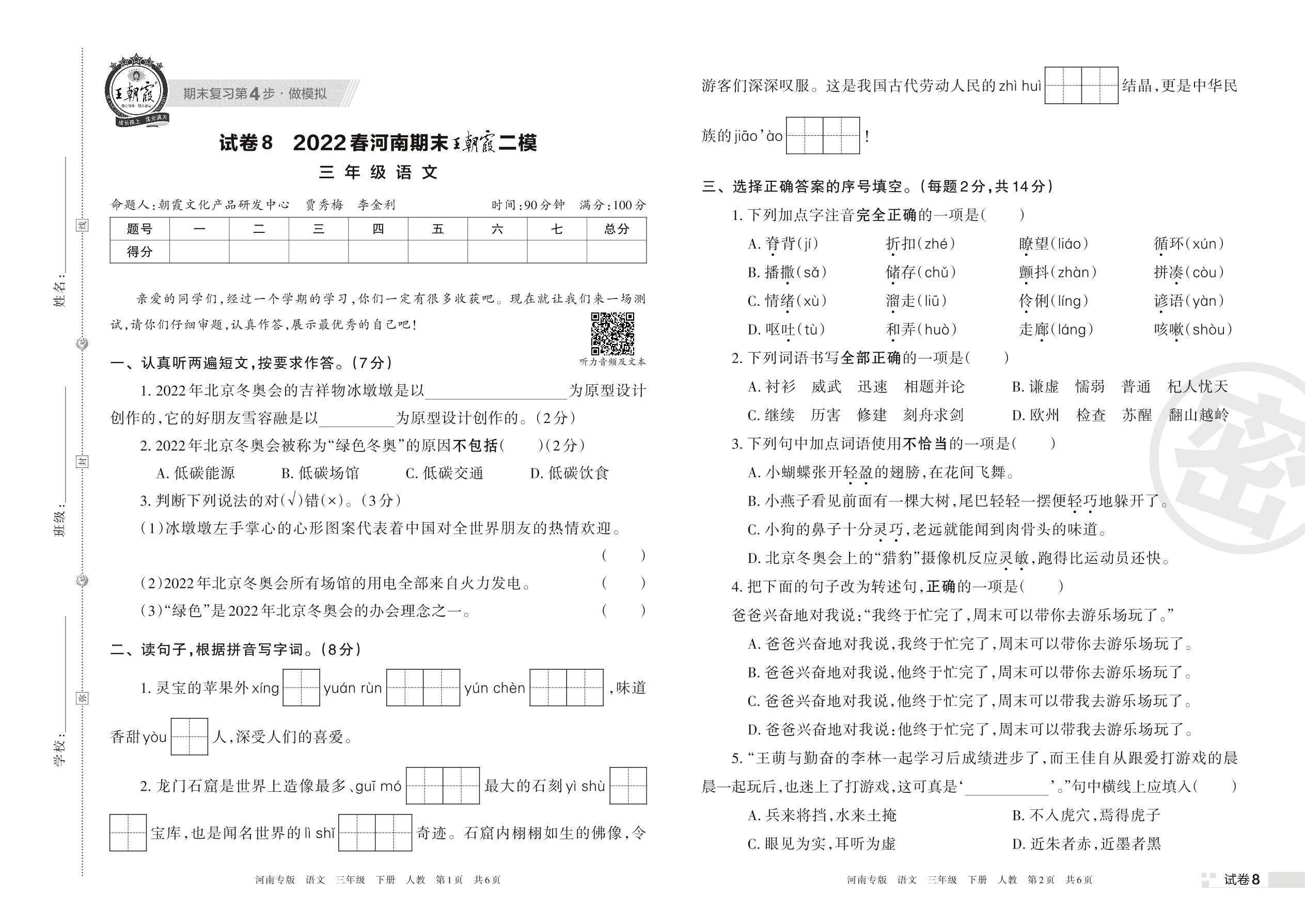 王朝霞期末模拟卷三年级下册语文(人教版)_R220331134145987【8】