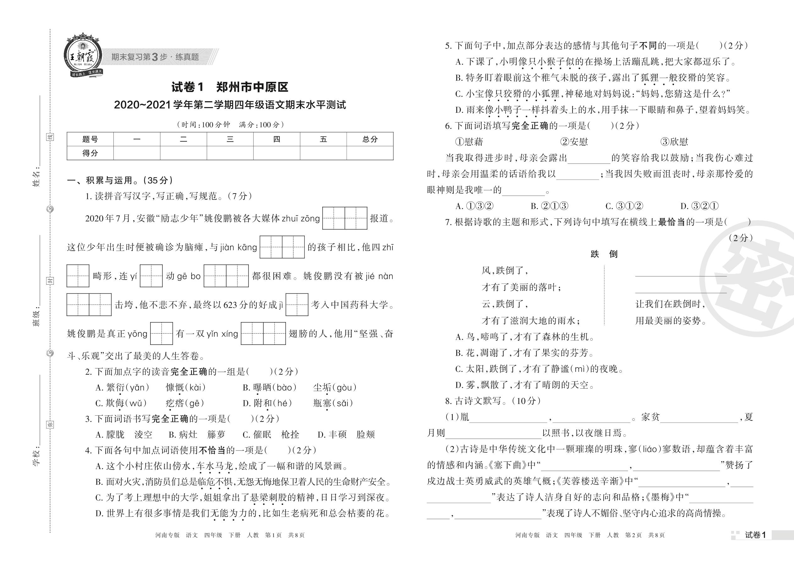 郑州市中原区2020~2021学年第二学期四年级语文期末水平测试(人教版)【1】