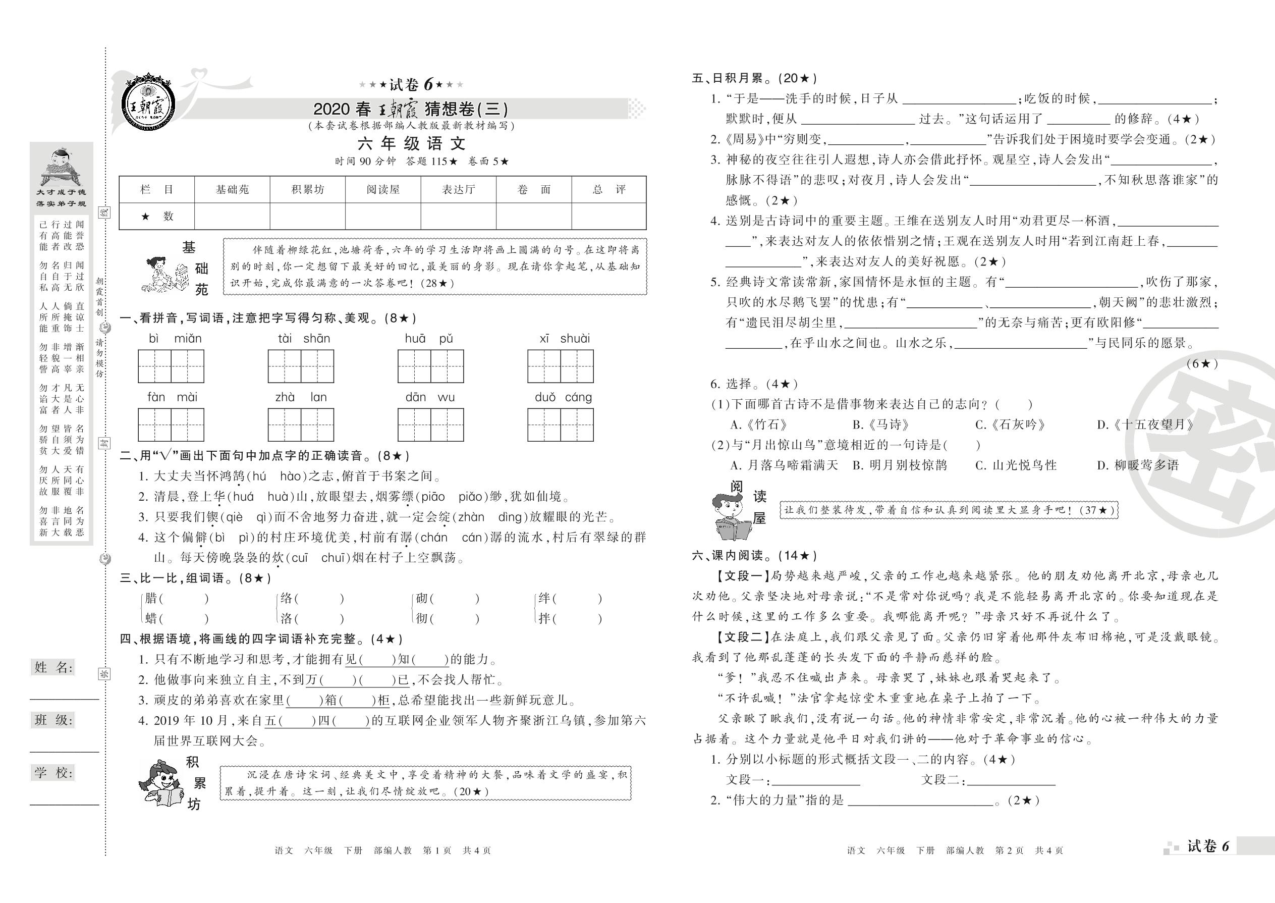 王朝霞期末猜想卷六年级下册语文(人教版)【6】