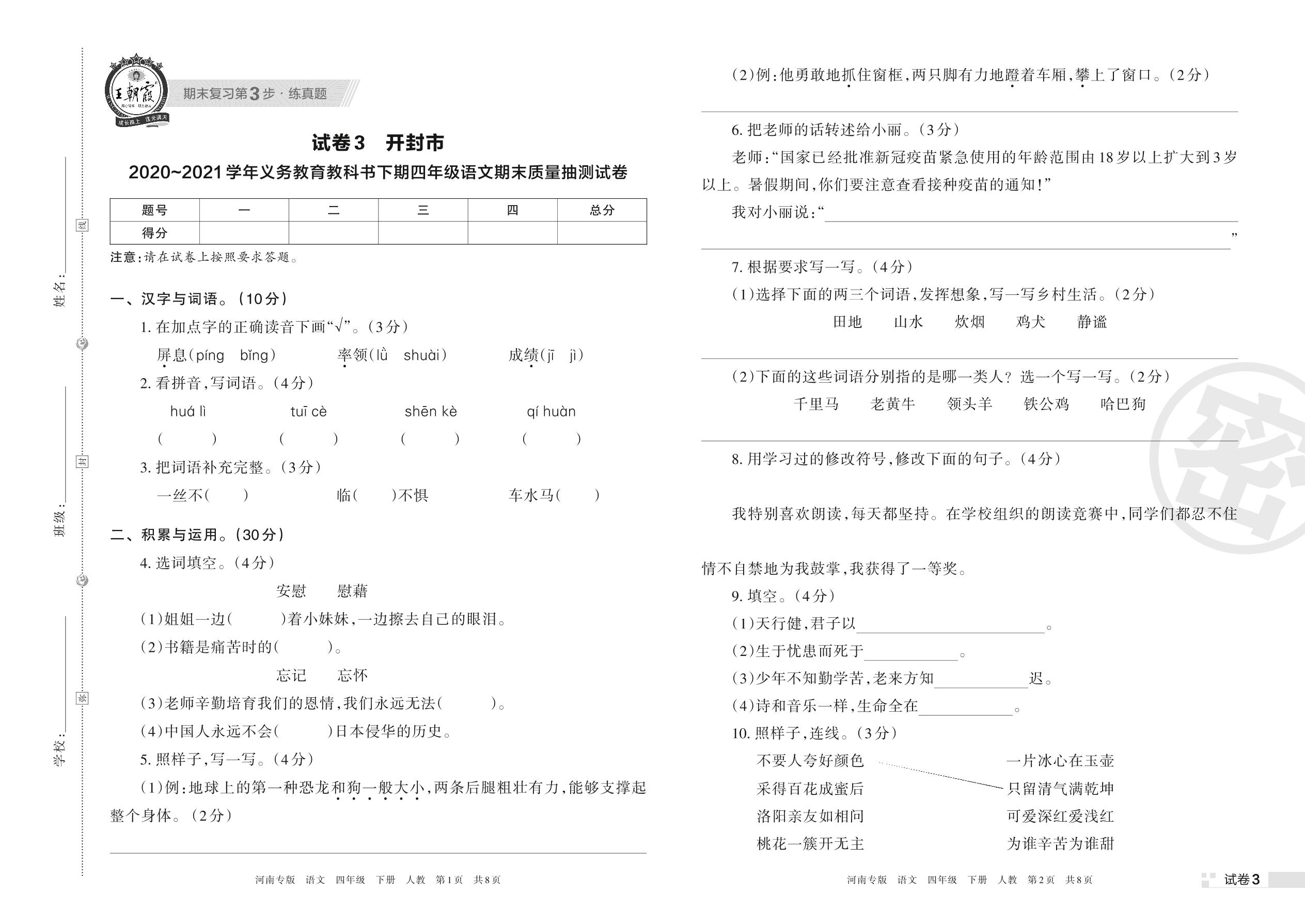 开封市2020~2021学年义务教育教科书下期四年级语文期末质量抽测试卷(人教版)【3】