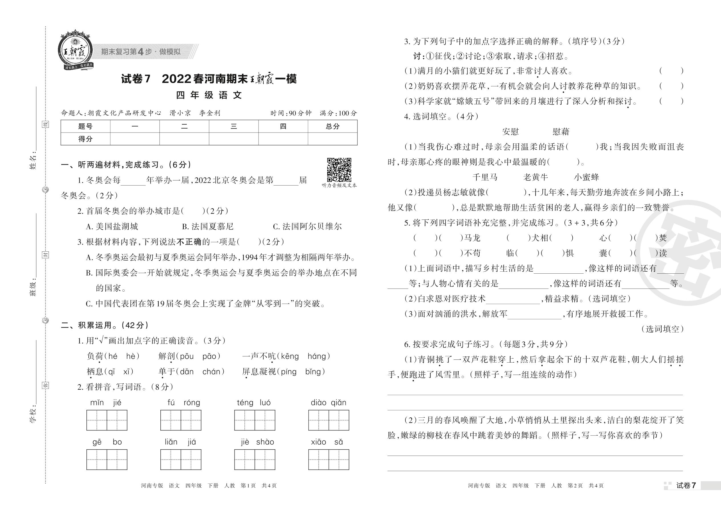 王朝霞期末模拟卷四年级下册语文(人教版)_R220331134736630【7】