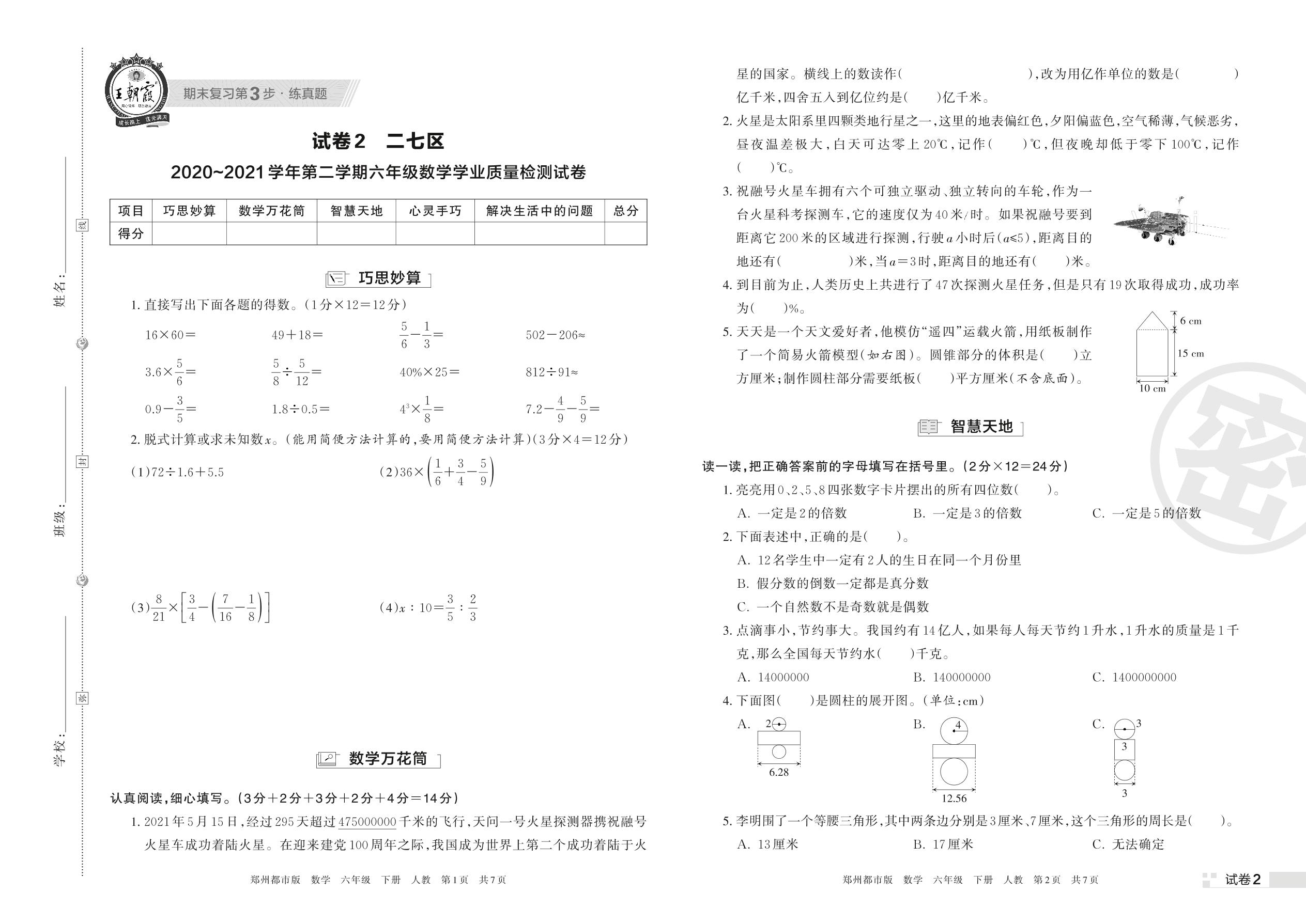 二七区2020~2021学年第二学期六年级数学学业质量检测试卷(人教版)【2】