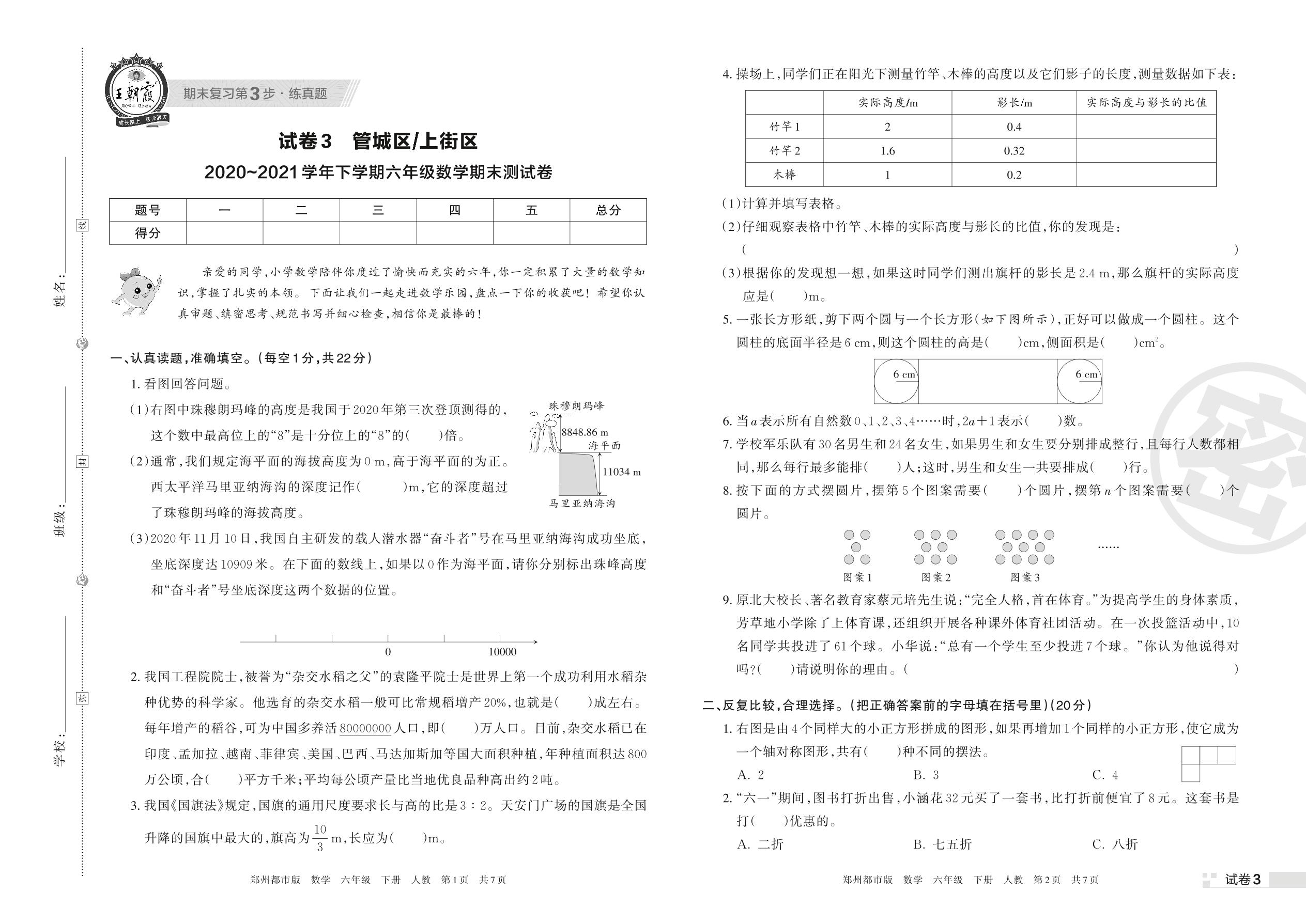 管城区、上街区2020~2021学年下学期六年级数学期末测试卷(人教版)【3】