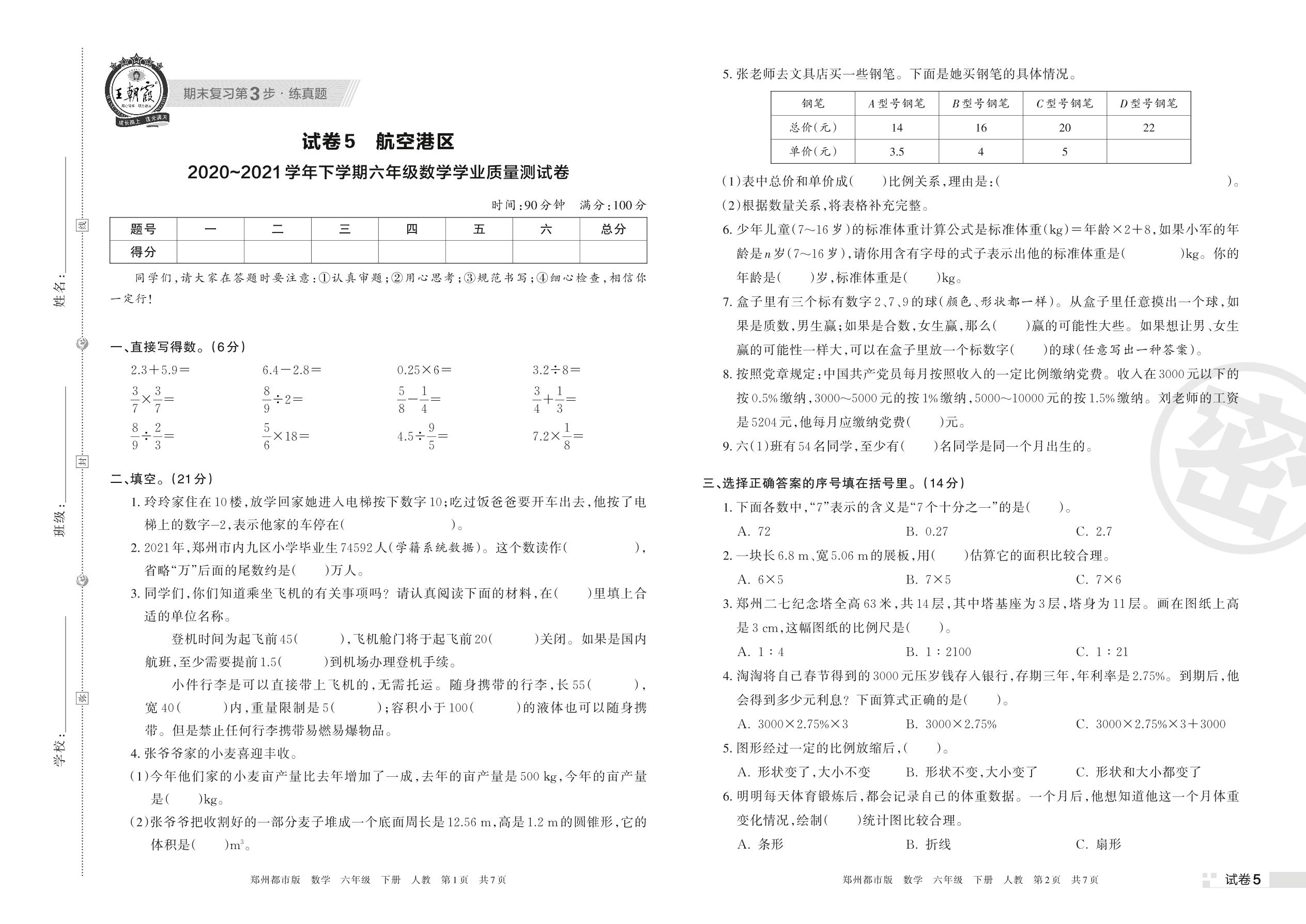 航空港区2020~2021学年下学期六年级数学学业质量测试卷(人教版)【5】