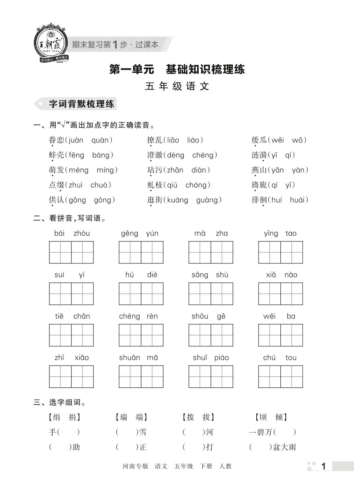 王朝霞期末过课本——第一单元 基础知识梳理练五年级下册语文(人教版)_R220331135503476