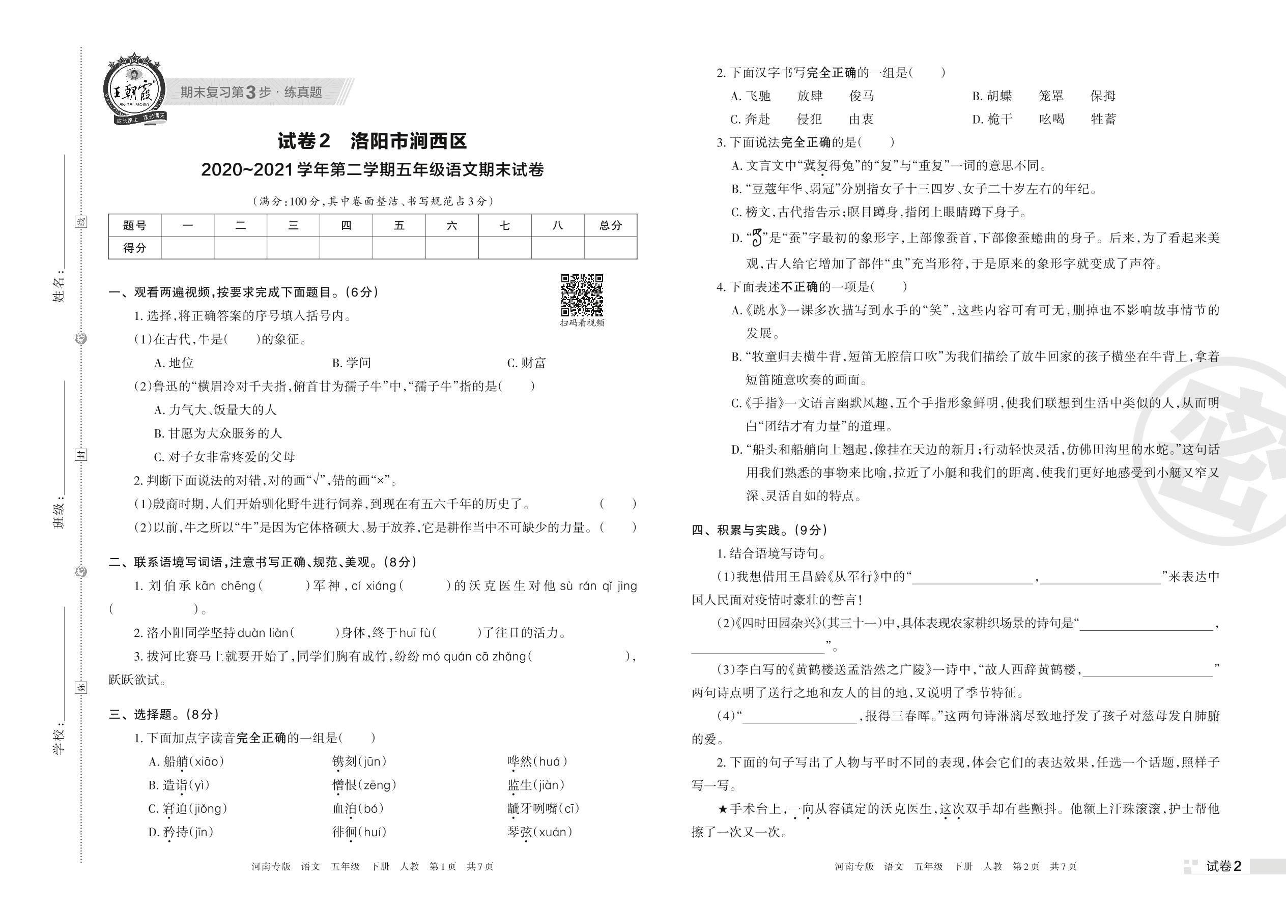 洛阳市涧西区2020~2021学年第二学期五年级语文期末试卷(人教版)【2】