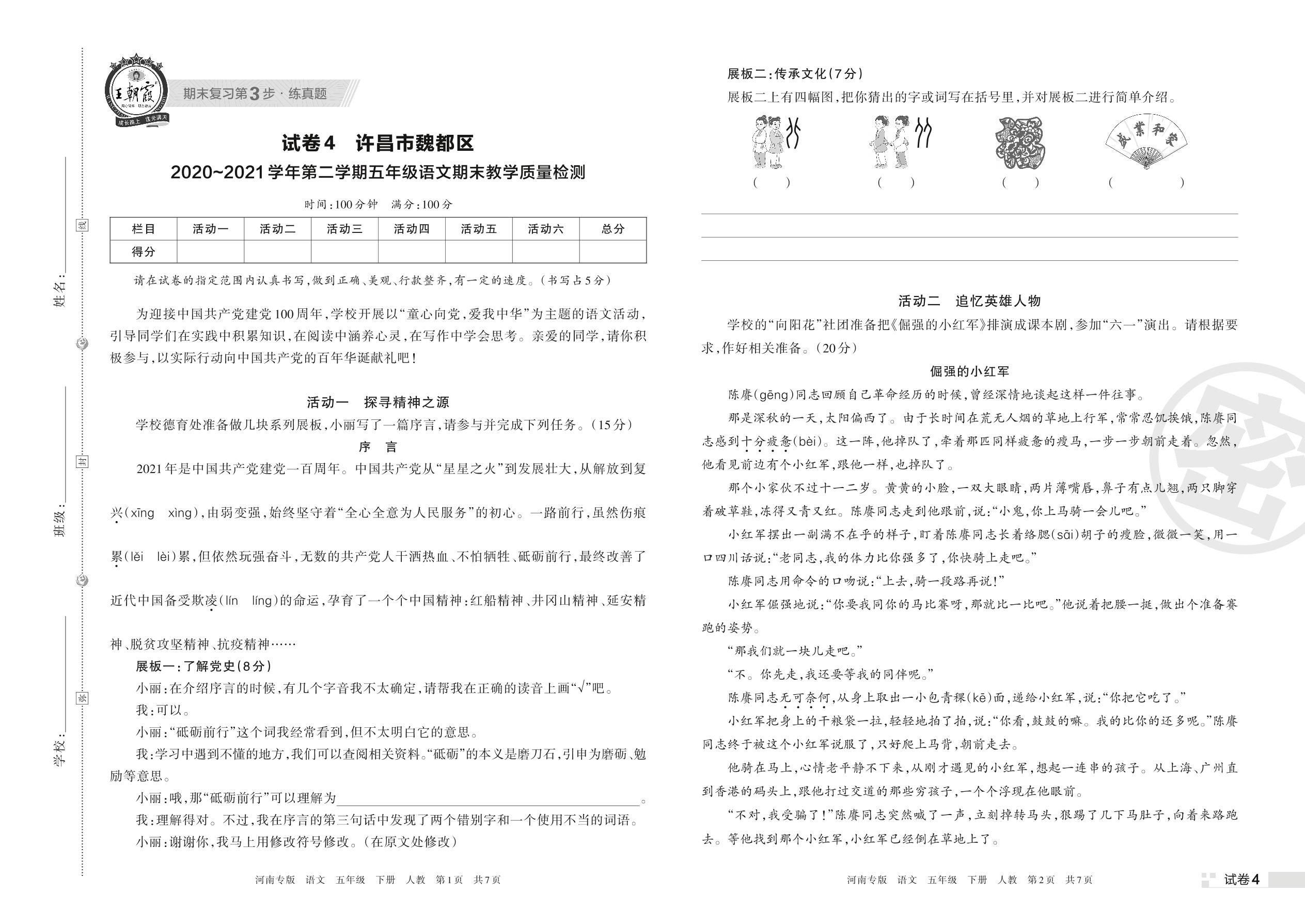 许昌市魏都区2020~2021学年第二学期五年级语文期末教学质量检测(人教版)【4】