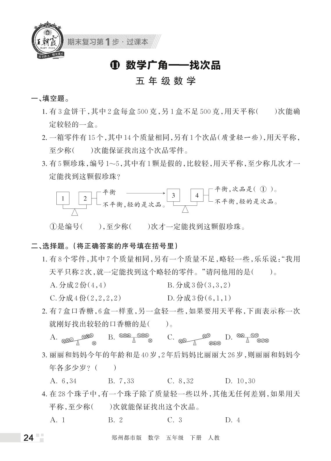 王朝霞期末过课本——11 数学广角:找次品五年级下册数学(人教版)_R220331135857291