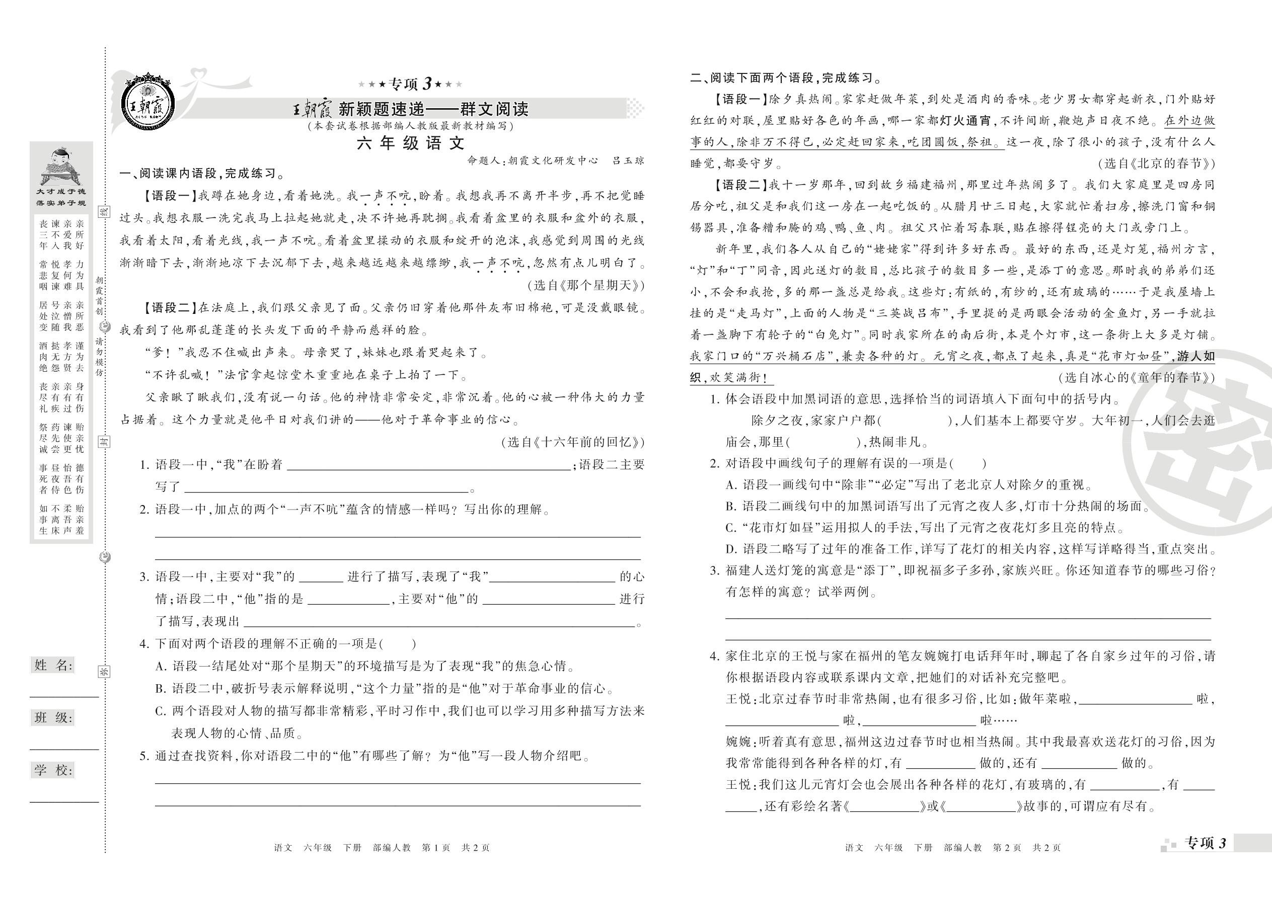 王朝霞期末专项卷——新颖题速递:群文阅读、古诗文阅读六年级下册语文(人教版)_R21080220421【0】
