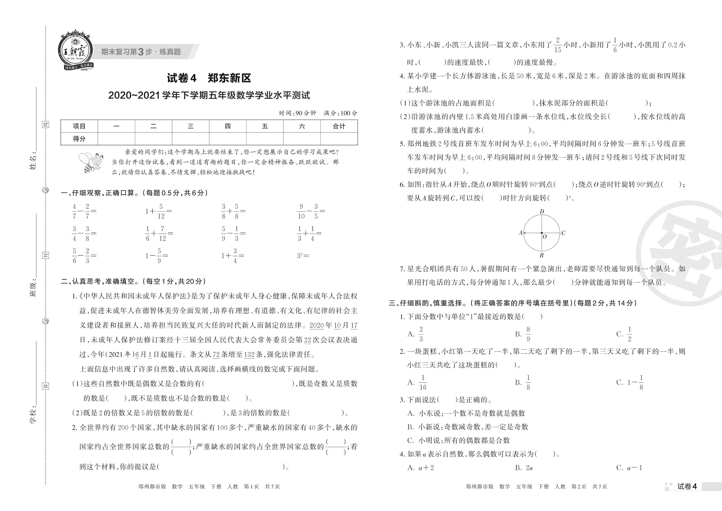 郑东新区2020~2021学年下学期五年级数学学业水平测试(人教版)【4】