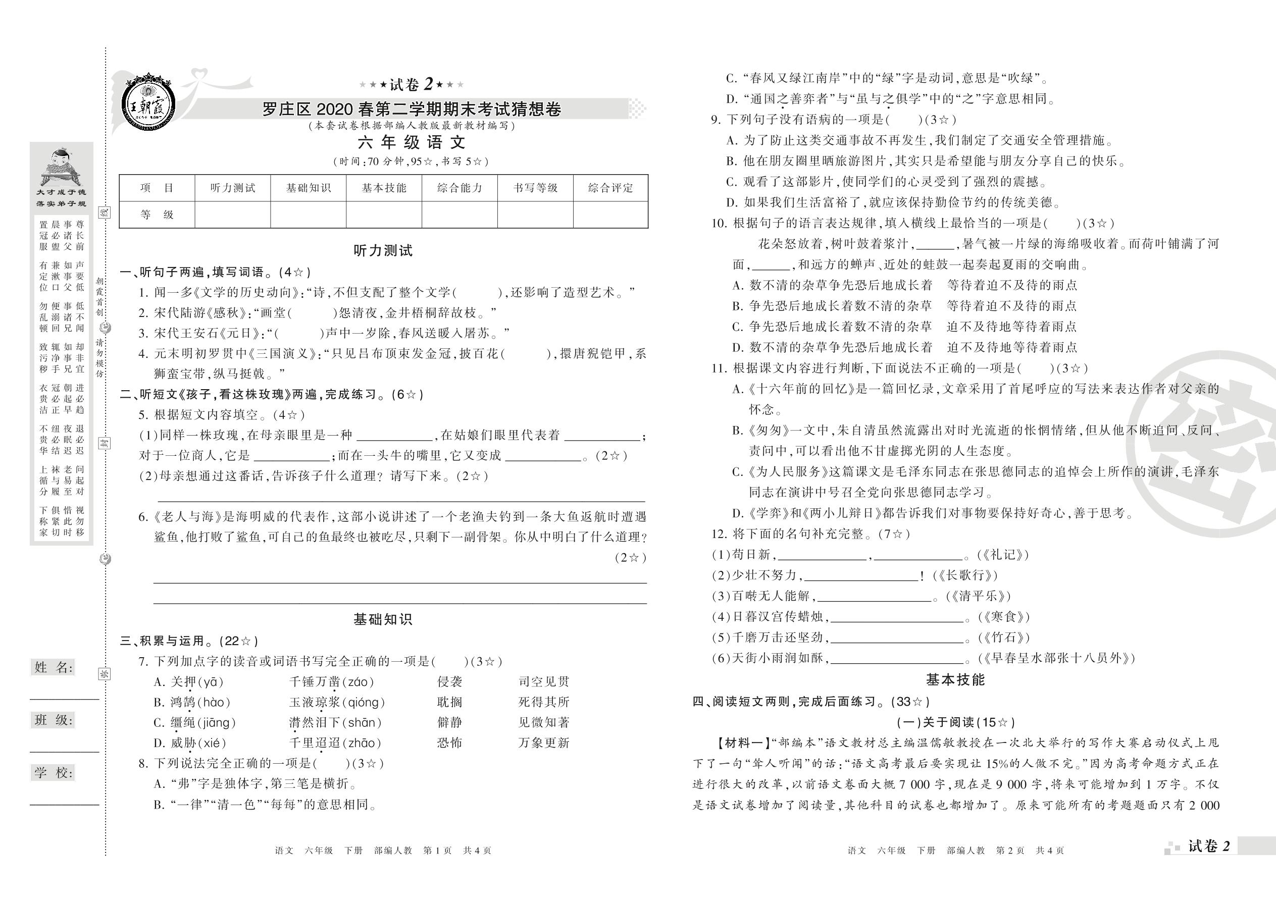 2018-2019学年第二学期临沂市罗庄区猜想卷六年级语文试卷(人教版)【2】