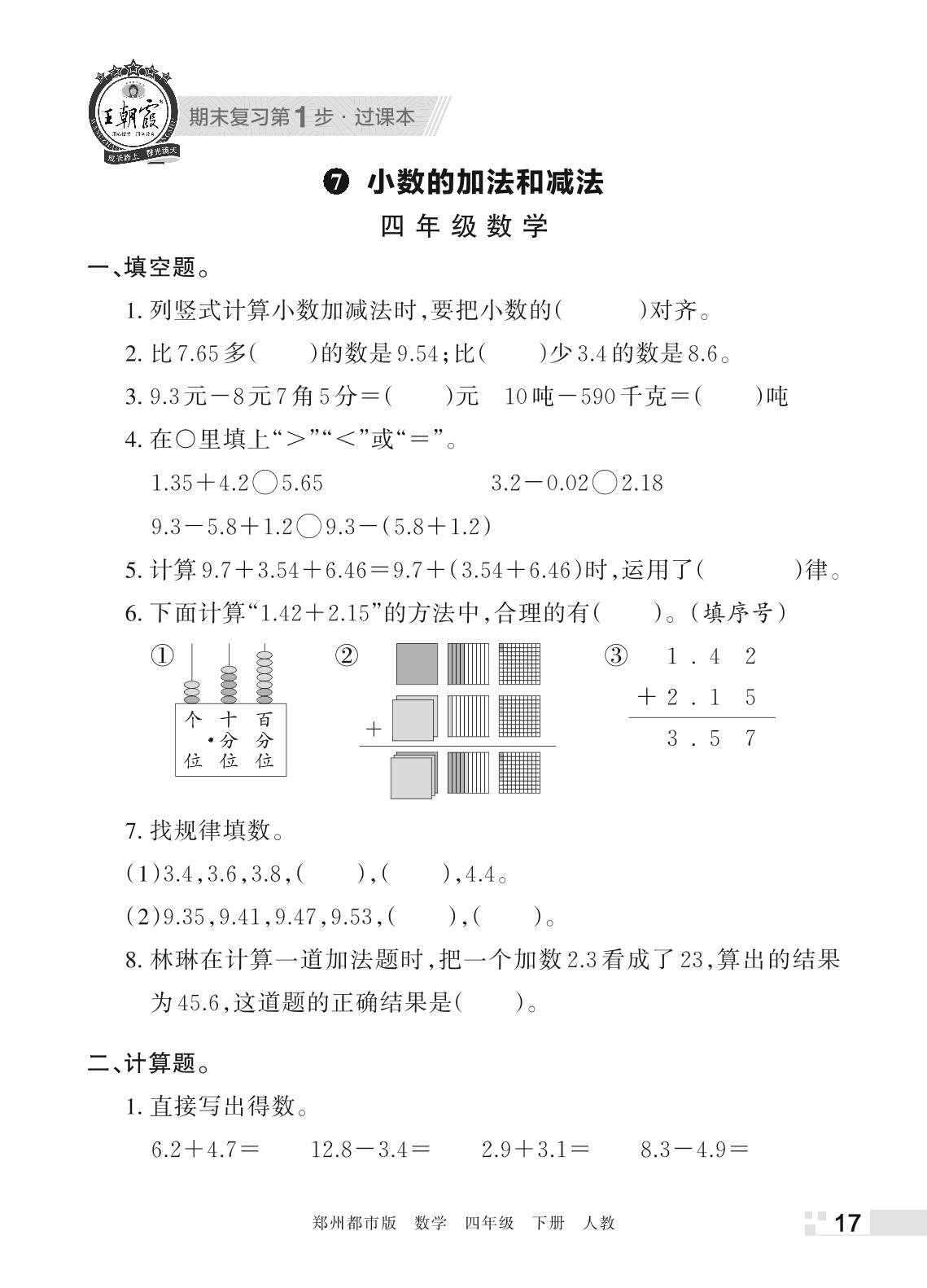 王朝霞期末过课本——7 小数的加法和减法四年级下册数学(人教版)_R220331140433564