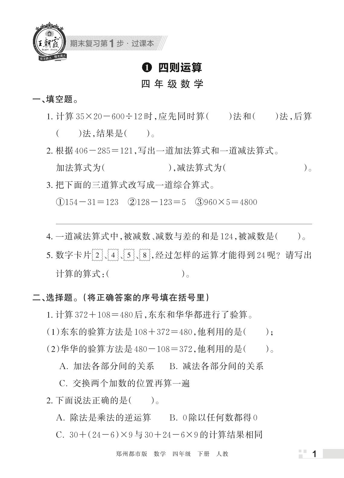 王朝霞期末过课本——1 四则运算四年级下册数学(人教版)_R220331140434499