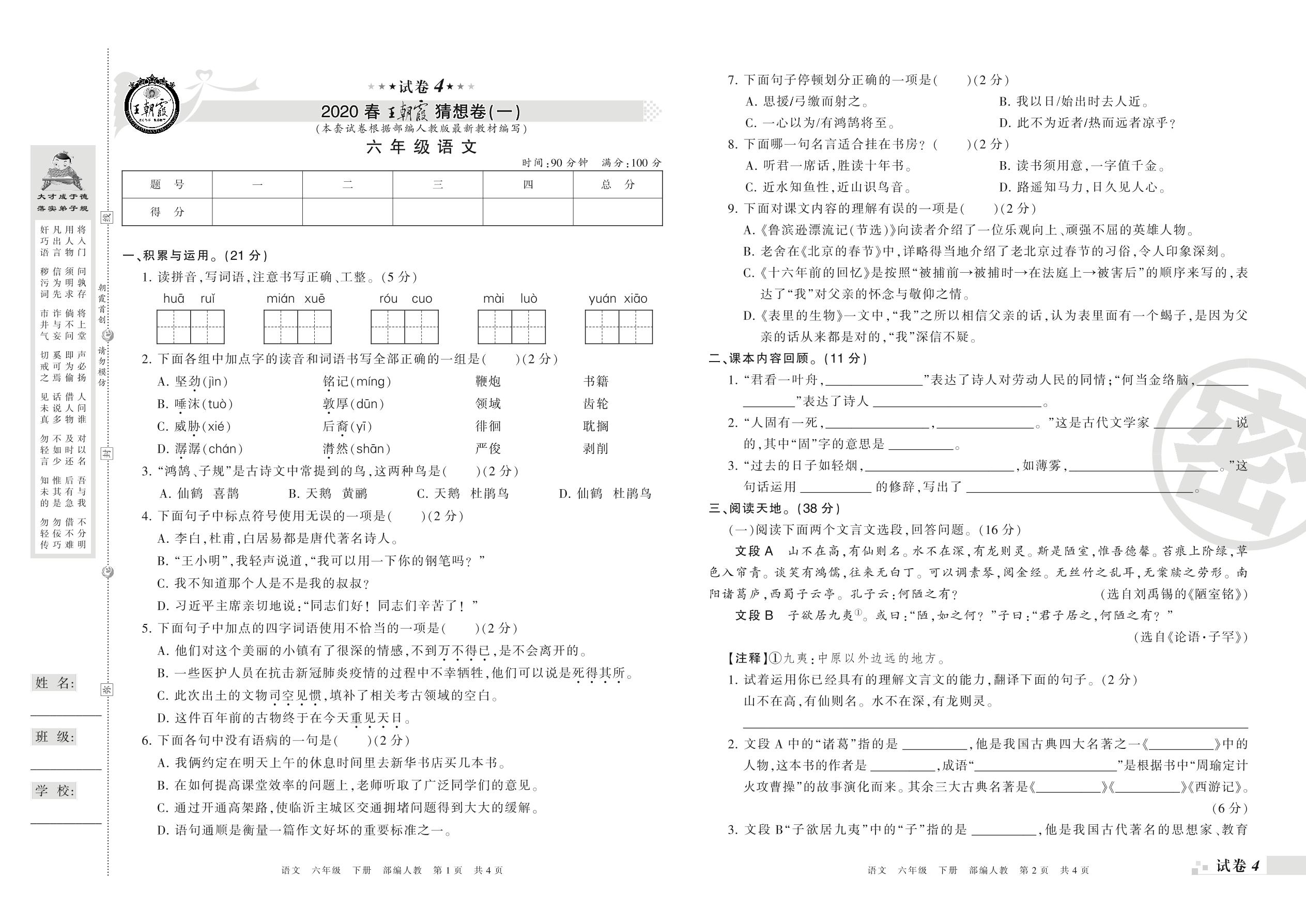 王朝霞期末猜想卷六年级下册语文(人教版)【4】