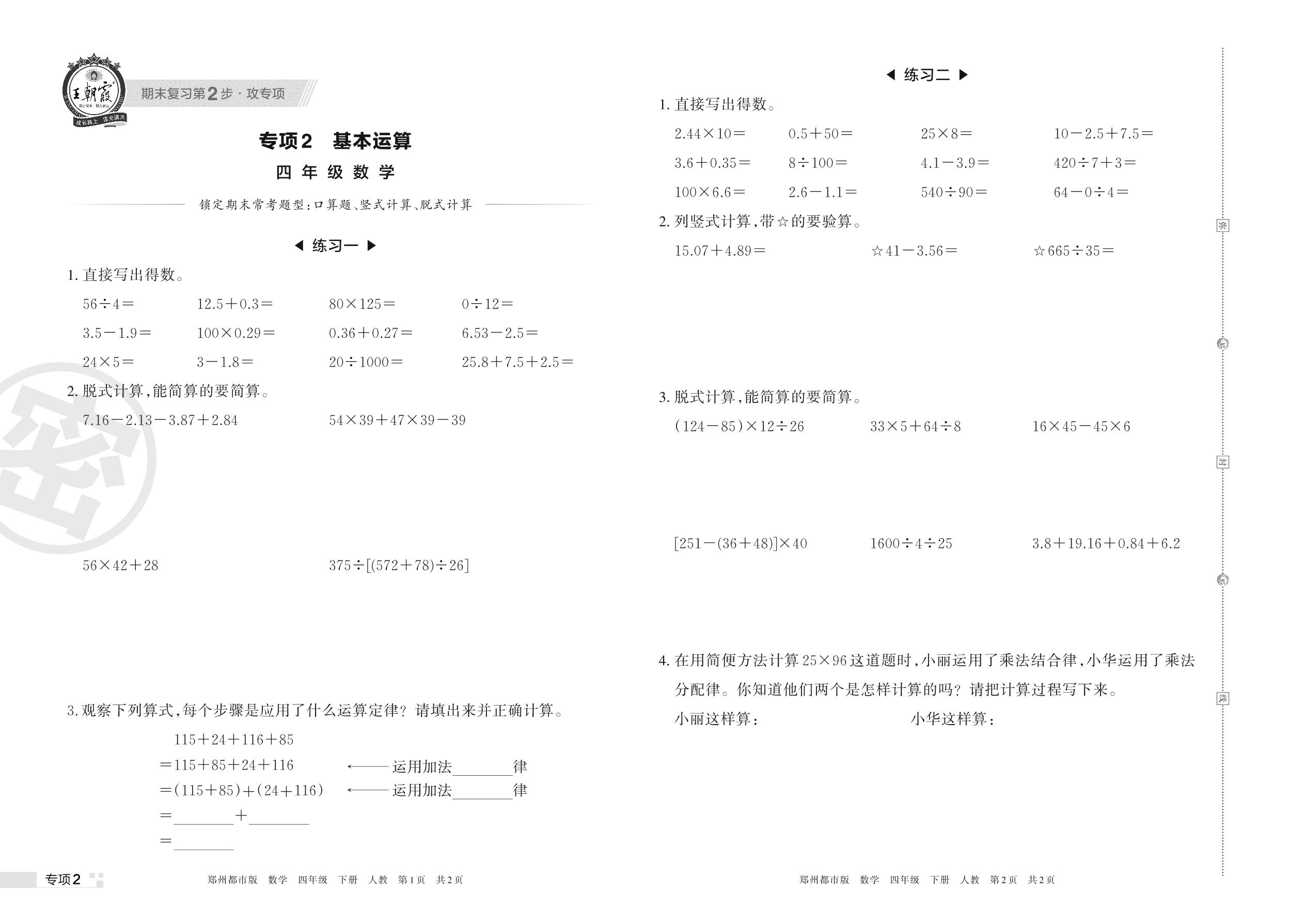 王朝霞期末专项卷——基本运算四年级下册数学(人教版)_R220331140434231【2】