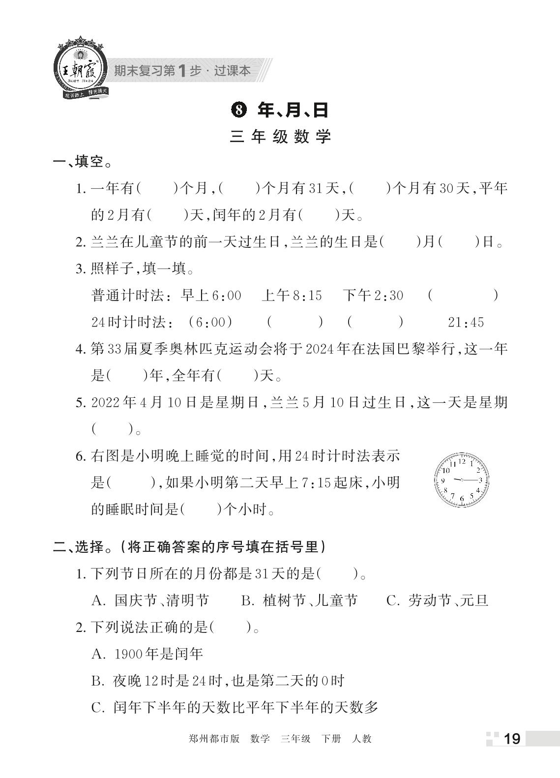 王朝霞期末过课本——8 年、月、日三年级下册数学(人教版)_R220331141112813